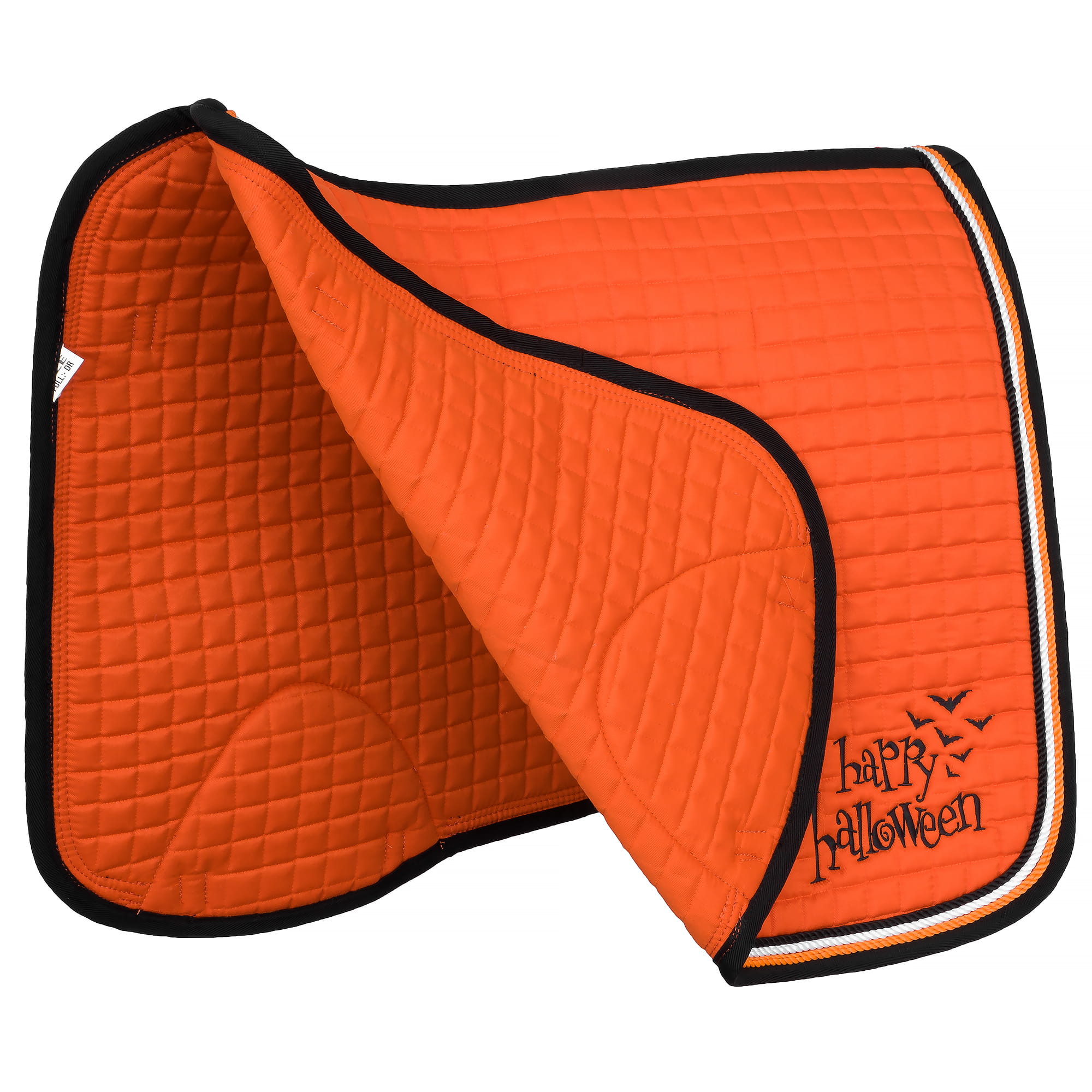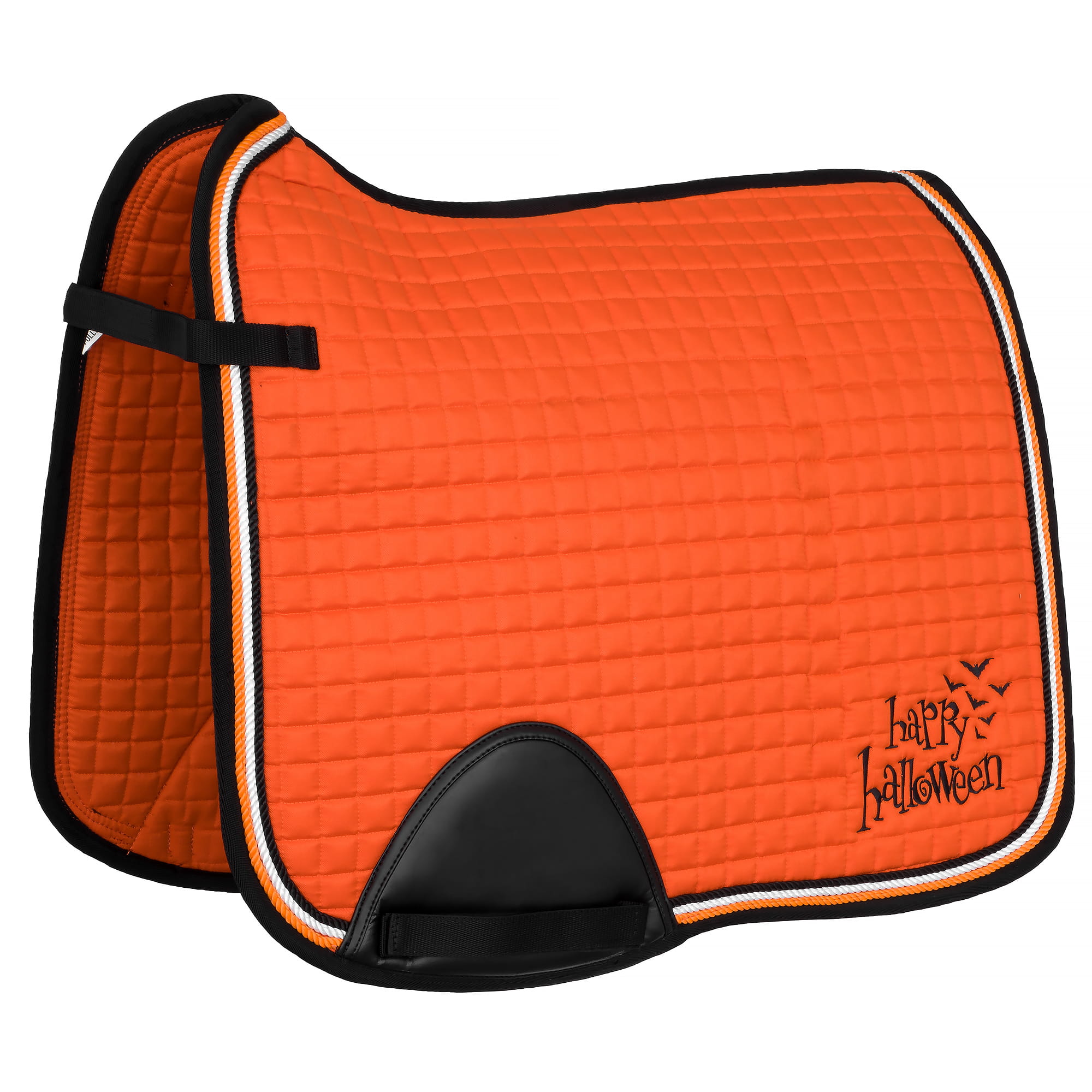 Czaprak START Halloween FlyingBats to wyjątkowy element jeździeckiego ekwipunku, który doskonale wpasowuje się w klimat Halloween. Jego intensywnie pomarańczowy kolor, charakterystyczny dla jesiennej pory, w połączeniu z czarnymi, latającymi nietoperzami tworzy niepowtarzalny, przyciągający wzrok design. Dodatkowo, wyszyty na tylnej części czapraka napis "Happy Halloween" podkreśla świąteczny nastrój, sprawiając, że jest to idealny wybór na treningi czy zawody organizowane w tym okresie.