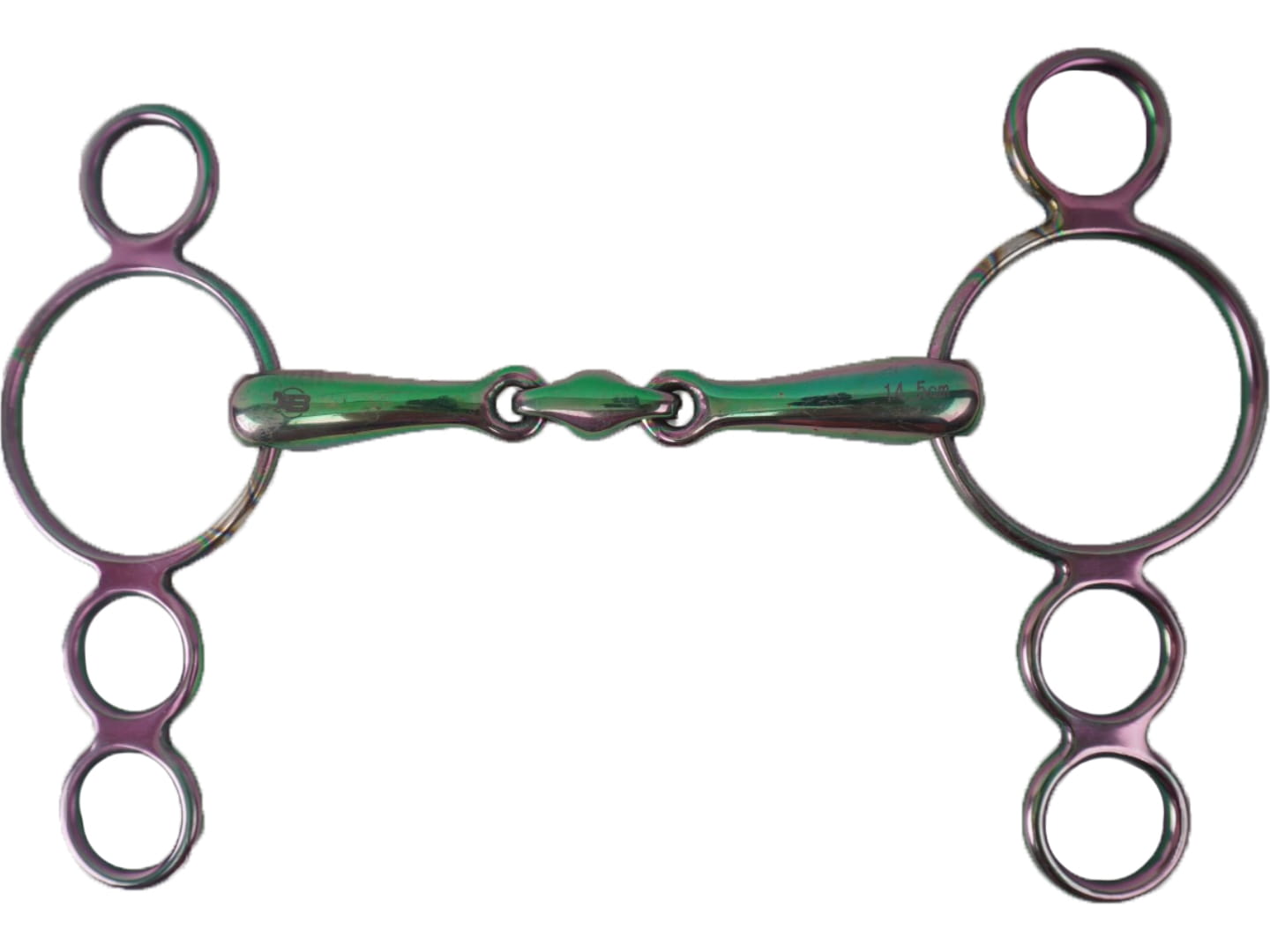 Nasze wędzidła są wolne od farb i barwników. Zabarwienie jest w rzeczywistości naturalną reakcją spowodowaną zanurzeniem tytanu w elektrycznie naładowanej wodzie. Wszystkie tęczowe wędzidła z obrotowym pierścieniem będą miały małe, bezbarwne ślady na pierścieniach. To nie wada, to efekt unikalnej metody barwienia.