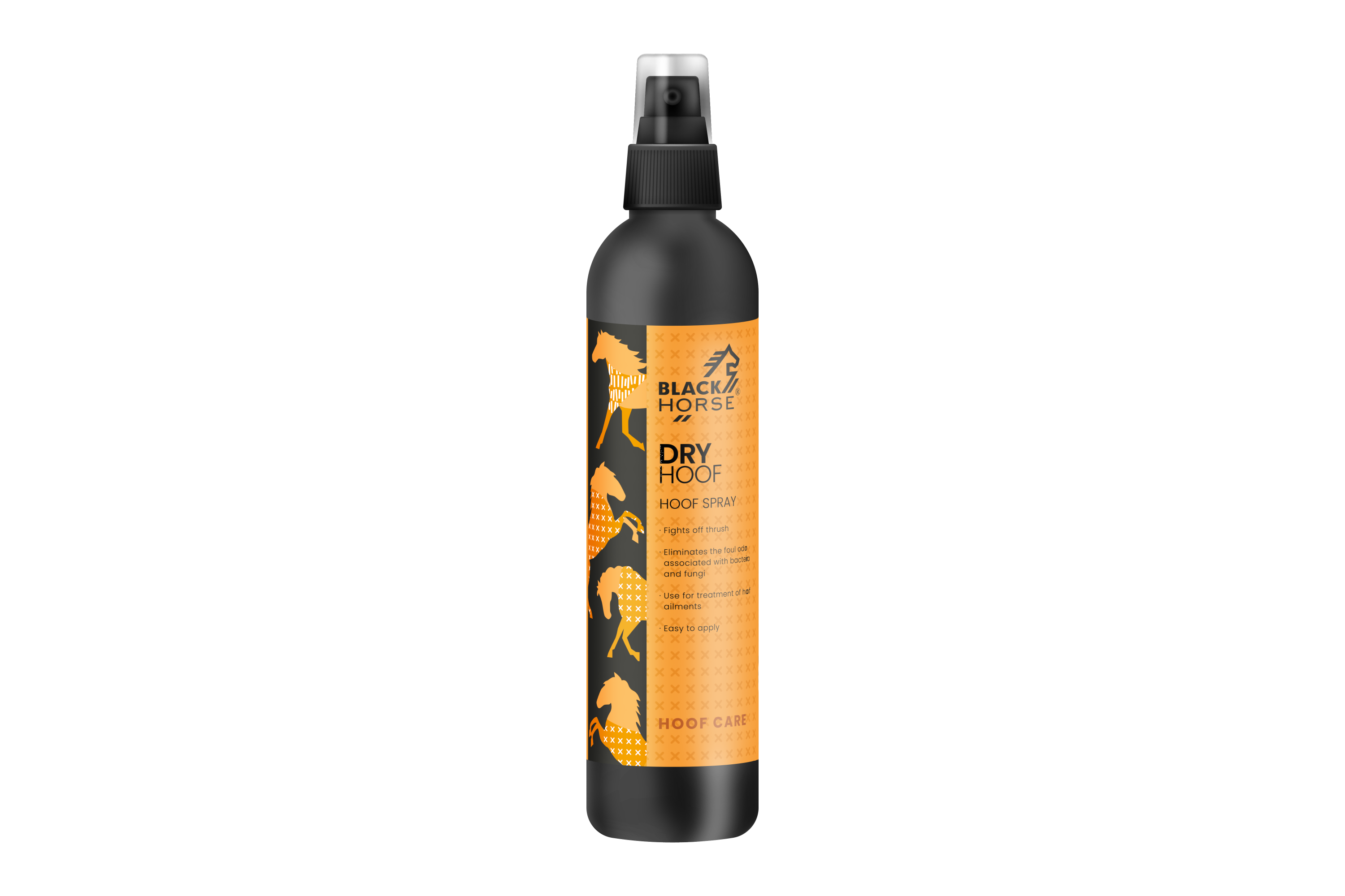 Płynny preparat Dry Hoof Spray do pielęgnacji okolic rowków strzałkowych i podeszwy kopyta. Do stosowania każdorazowo po korekcji kopyt, przy rozczyszczaniu kopyt u koni stojących na wilgotnym podłożu, w przypadku wystąpienia problemu gnijących strzałek. Kompozycja siarczanów miedzi, cynku i glinu wykazuje działanie ściągające, antyseptyczne i przeciwzapalne. Likwiduje nieprzyjemny zapach, który towarzyszy problemowi gnicia.