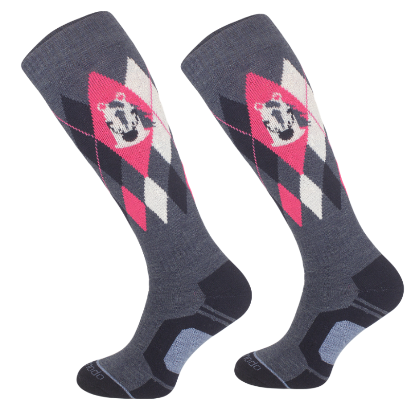 Podkolanówki jeździeckie z motywem konika i geometrycznym wzorem. W ich składzie znajduje się 50% wełny merynosa, 30% akrylu, 15% poliamidu oraz 5% elastanu. Taka proporcja włókien zapewnia skuteczną izolację termiczną oraz miękką, przyjemną w dotyku powierzchnię, która wspiera komfort w chłodniejsze dni. Wełna merynosowa odpowiada za naturalną regulację temperatury i odprowadzanie wilgoci, co poprawia wygodę przy dłuższym wysiłku. Domieszka akrylu zwiększa lekkość przędzy i pozwala zachować kształt po częstym użytkowaniu. Poliamid wzmacnia newralgiczne części skarpety, co wpływa na większą odporność na przetarcia. Elastyczne włókna dbają o dopasowanie, dzięki czemu podkolanówki utrzymują się na właściwej wysokości przez cały trening.