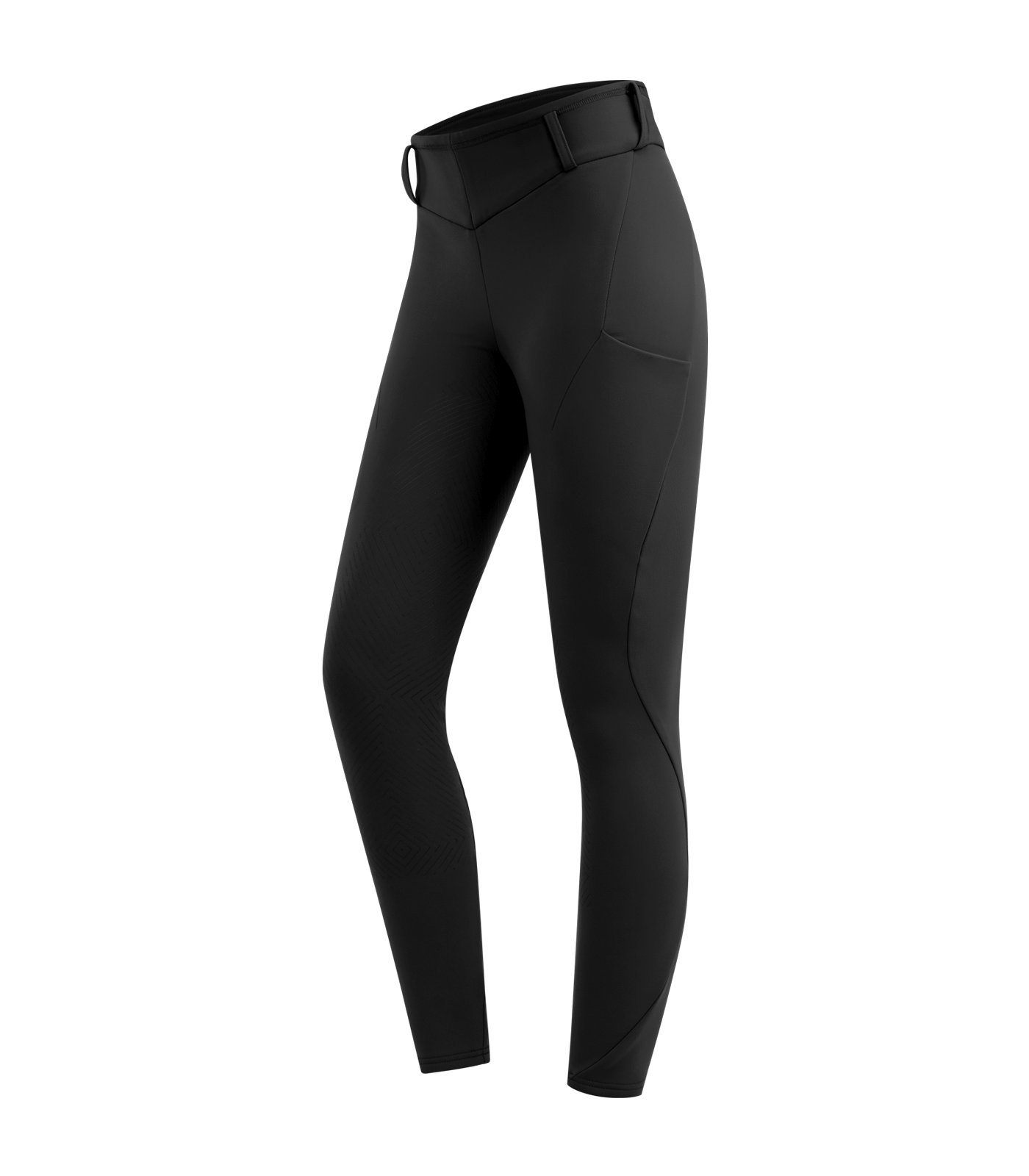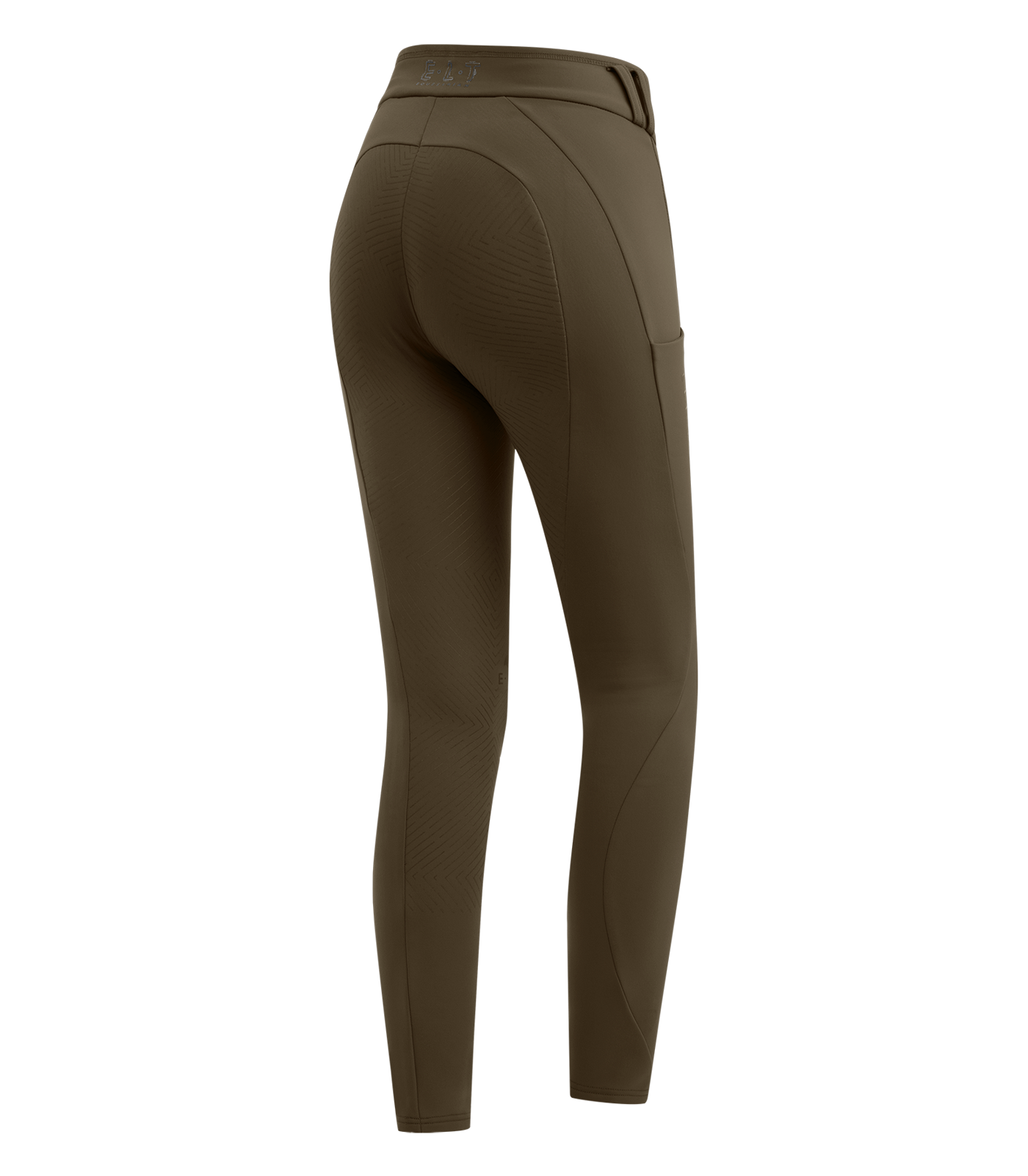 Wnętrze ociepla polarowa podszewka, a zewnętrzna warstwa odpycha wodę przy lekkiej wilgoci. Tkanina oddycha i jest bi-elastyczna, więc swobodnie podąża za ruchem podczas jazdy w hali i w terenie. Po bokach znajdują się dwie kieszenie na telefon, z prawej z silikonowym napisem E·L·T Equestrian, a na tyle pasa umieszczono silikonowe oznaczenie marki.