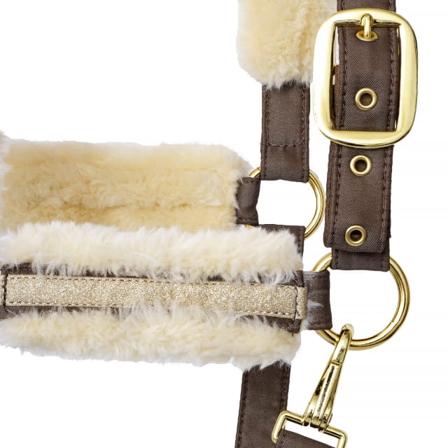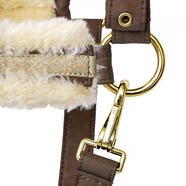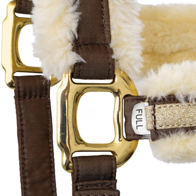 Kantar Equestrian Queen Riga to połączenie wytrzymałości i elegancji. Wykonany z mocnej taśmy, jest nie tylko trwały, ale także komfortowy dla konia, dzięki podszyciu sztucznym futerkiem, które chroni przed otarciami. Zdobiony metaliczną tasiemką oraz haftem, kantar zyskuje estetyczny i stylowy wygląd. Posiada szeroką regulację, co pozwala na precyzyjne dopasowanie do głowy konia, a wytrzymałe okucia zapewniają solidność i długotrwałe użytkowanie.