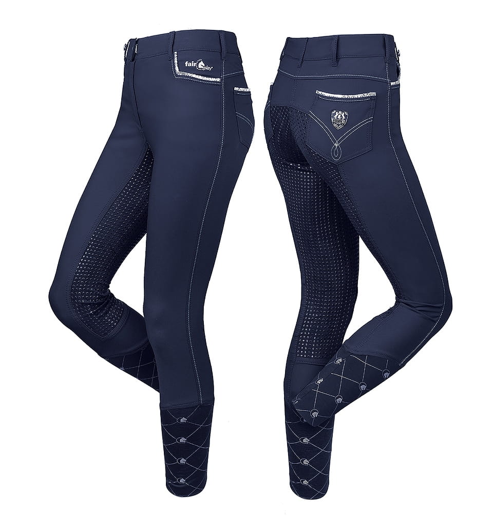 - Efektowne zdobienia: bryczesy zostały ozdobione połyskującym haftem oraz stylową naszywką z logo Fair Play, co nadaje im unikalnego charakteru.