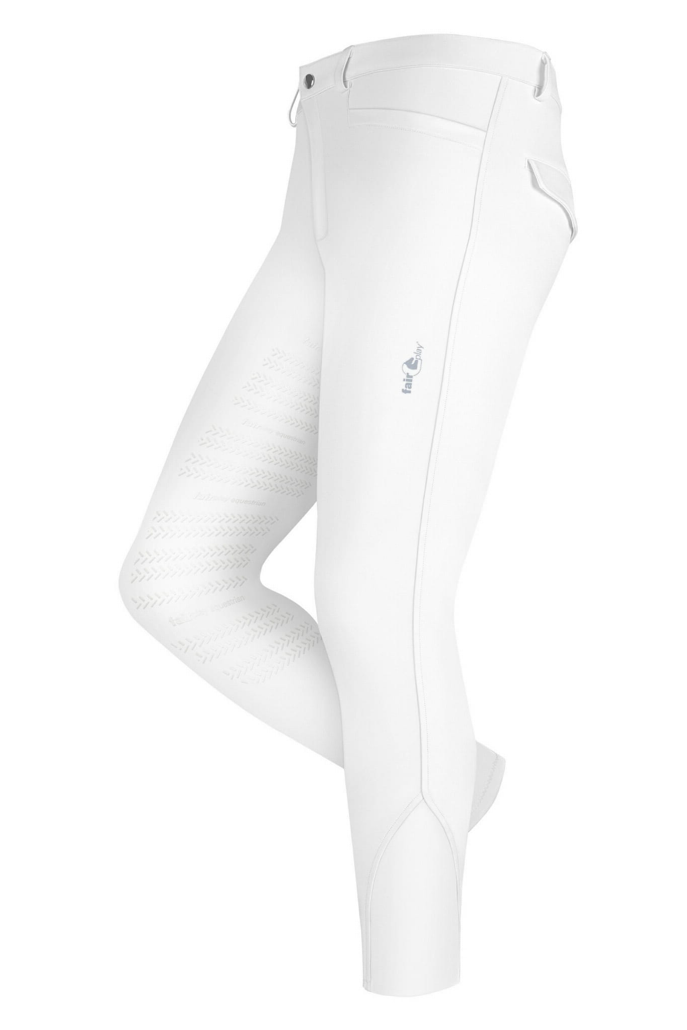 Bryczesy SIMON marki Fair Play to męskie spodnie konkursowe zaprojektowane do jazdy konnej. Model powstał z tkaniny o czterokierunkowej rozciągliwości, co wspiera swobodę ruchu w siodle i podczas zsiadania. Konstrukcja ma krój dopasowany do pozycji jeźdźca, dzięki czemu materiał nie marszczy się przy kolanie ani w pachwinie.