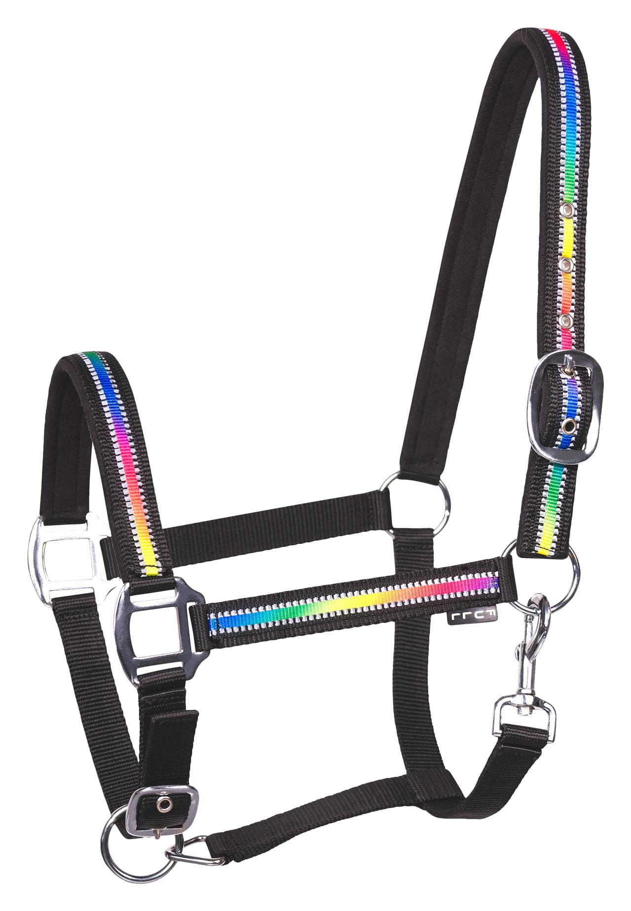 Kantar ozdobiono wielobarwną taśmą odblaskową, która zwiększa widoczność zwierzęcia po zmroku i w trudnych warunkach oświetleniowych. To rozwiązanie poprawia bezpieczeństwo, szczególnie podczas spacerów czy transportu.