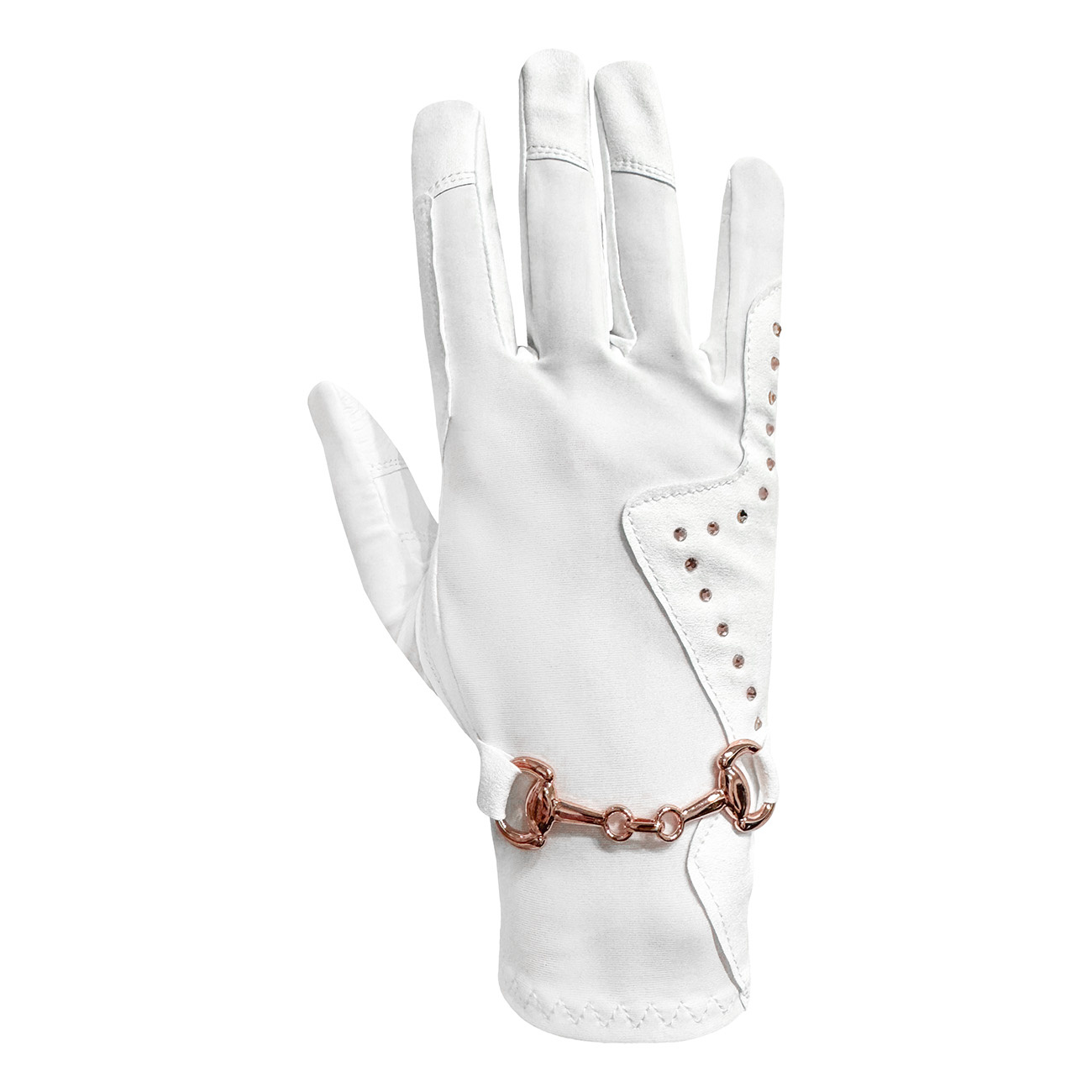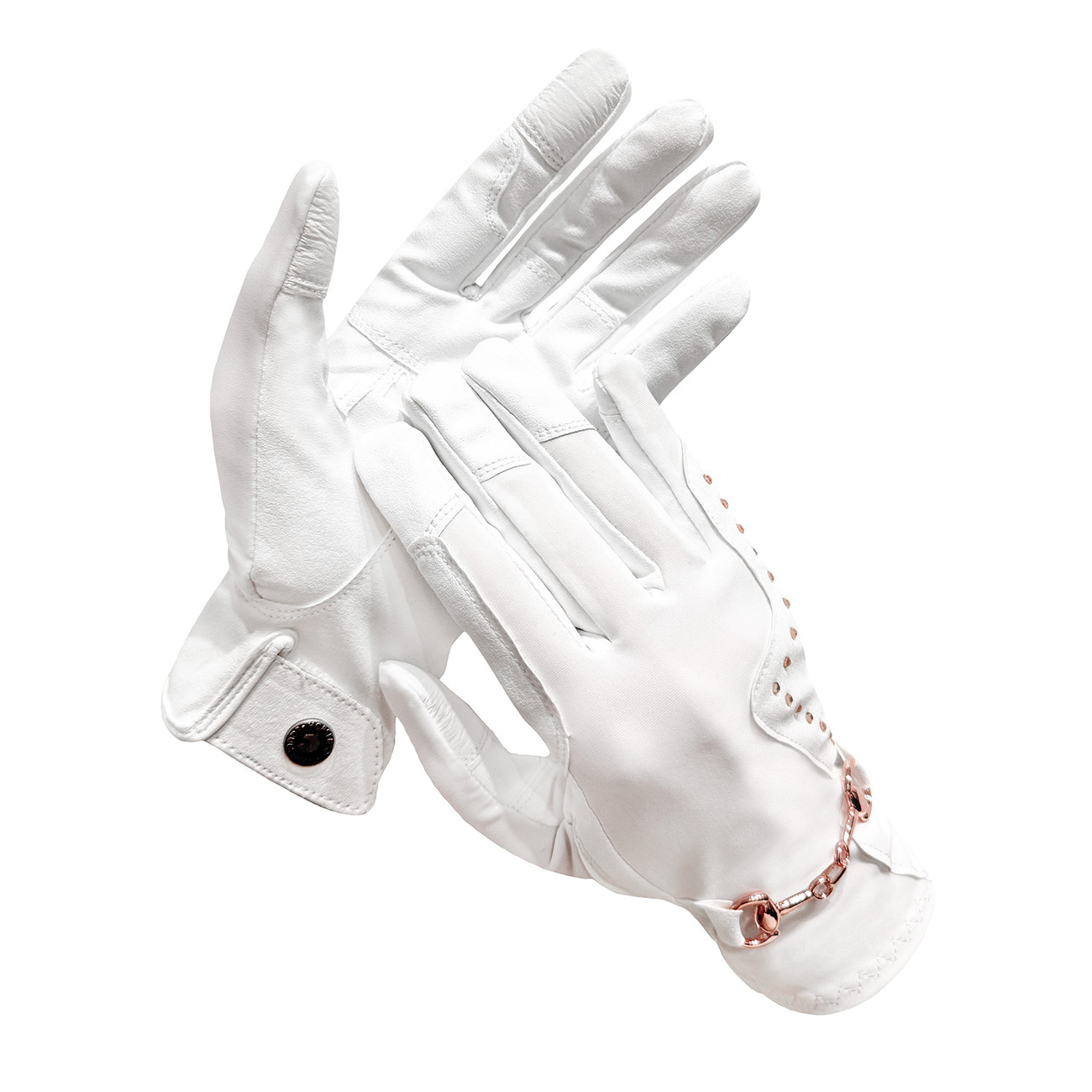 Zapięcie na rzep przy nadgarstku pozwala na precyzyjne dopasowanie i stabilne utrzymanie rękawiczek na dłoni. Na zewnętrznej stronie umieszczono dekoracyjne cyrkonie oraz metalowy element w formie miniaturowego wędzidła. Skład materiału to 100% poliester.