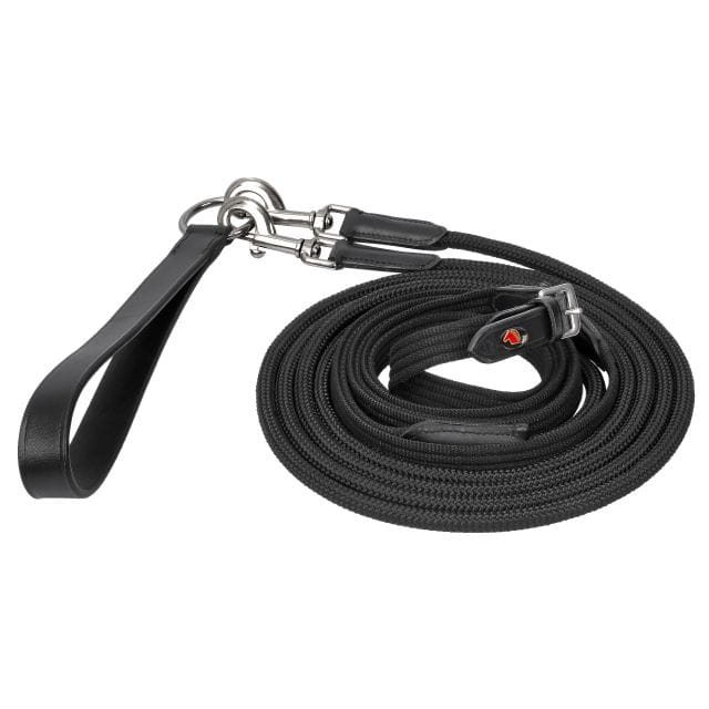 Czarna wodza parciana z linką START to niezastąpione narzędzie w czasie treningów, które pomaga w obniżeniu głowy konia oraz zaokrągleniu szyi i grzbietu. Wykonana z wytrzymałej, parcianej taśmy, wodza łączy solidność z wygodą użytkowania. Dodatkowo, połączona z mocną, nylonową linką, zapewnia trwałość i elastyczność. Srebrne okucia i klasyczny karabińczyk umożliwiają szybkie i wygodne wpinanie, co sprawia, że wodza jest łatwa w użyciu. Wodza ma szerokość 2 cm, długość jednej strony wodzy wynosi 260 cm, a długość linki to 135 cm.