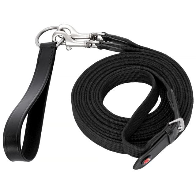 Czarna wodza parciana START to klasyczne narzędzie wykonane z wytrzymałej taśmy bawełnianej, które zapewnia niezawodność i komfort użytkowania. Wodza jest wyposażona w łatwe i szybkie wpięcie za pomocą karabińczyków, co zapewnia wygodę i funkcjonalność. Metalowe elementy zostały wykonane ze stali nierdzewnej, a paski ze skóry bawolej, do których przymocowane są okucia, zwiększają trwałość wodzy. Całkowita długość wodzy wynosi 540 cm, a szerokość 22 mm, co zapewnia odpowiednią wygodę w użyciu.