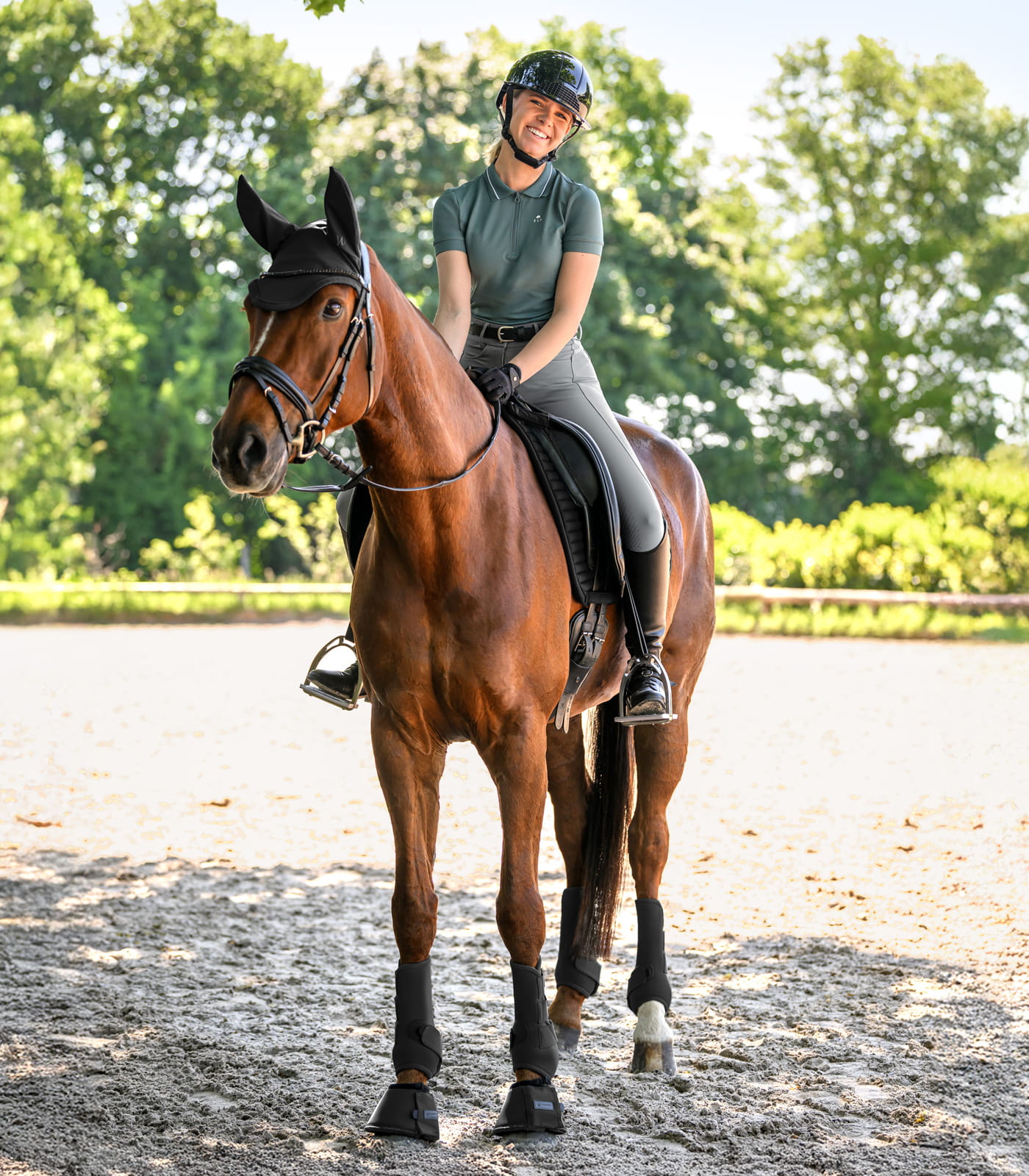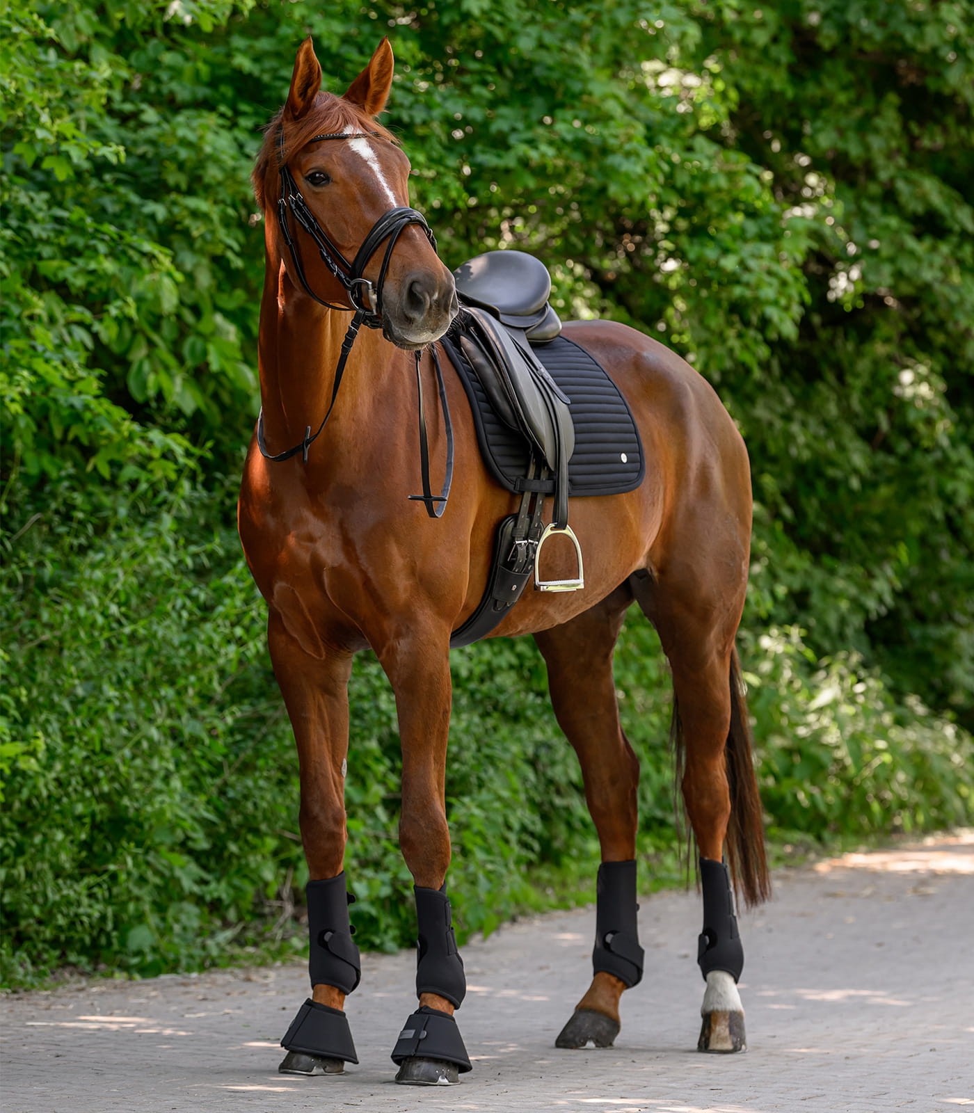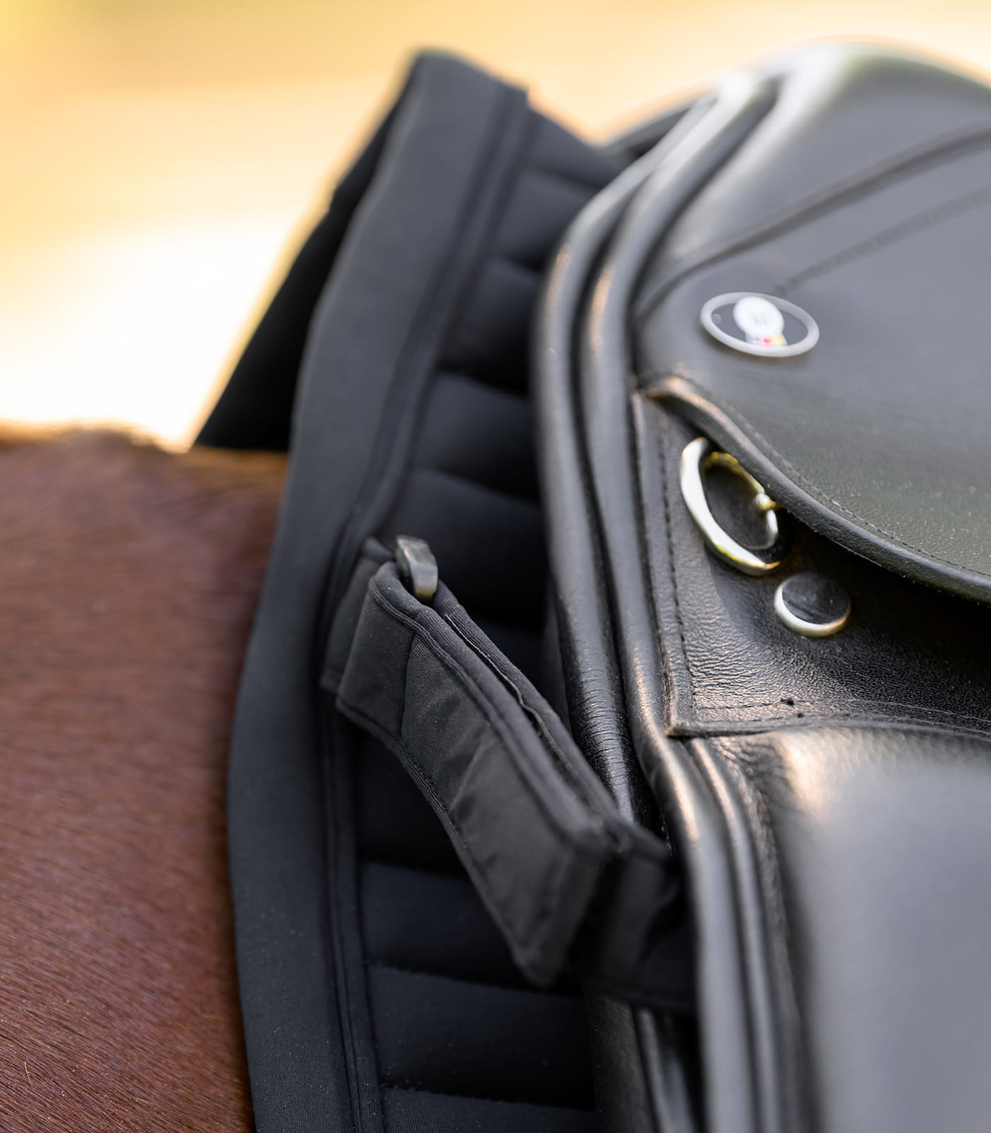 Wypełnienie z pianki poliuretanowej wspiera równomierne rozłożenie nacisku i stabilne ułożenie. Szlufki do popręgu z trzema punktami mocowania pomagają utrzymać właściwe położenie w trakcie ruchu. Odpinane szlufki na rzep ułatwiają zakładanie i zdejmowanie, co usprawnia codzienne użytkowanie. Całość zaprojektowano z myślą o funkcjonalności i trwałości.
