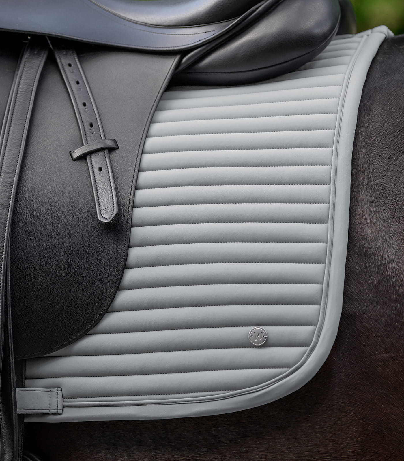 Wykończenie z krzyżowym pikowaniem, tonalną lamówką oraz metalową płytką w kolorze srebra nadaje uporządkowany wygląd. Warstwa zewnętrzna zawiera nylon i elastan, co zwiększa elastyczność i odporność na zużycie. Podszewka poliestrowa wspiera łatwą pielęgnację. Czaprak można prać w temperaturze 30°C, zaleca się delikatny program i użycie worka do prania.
