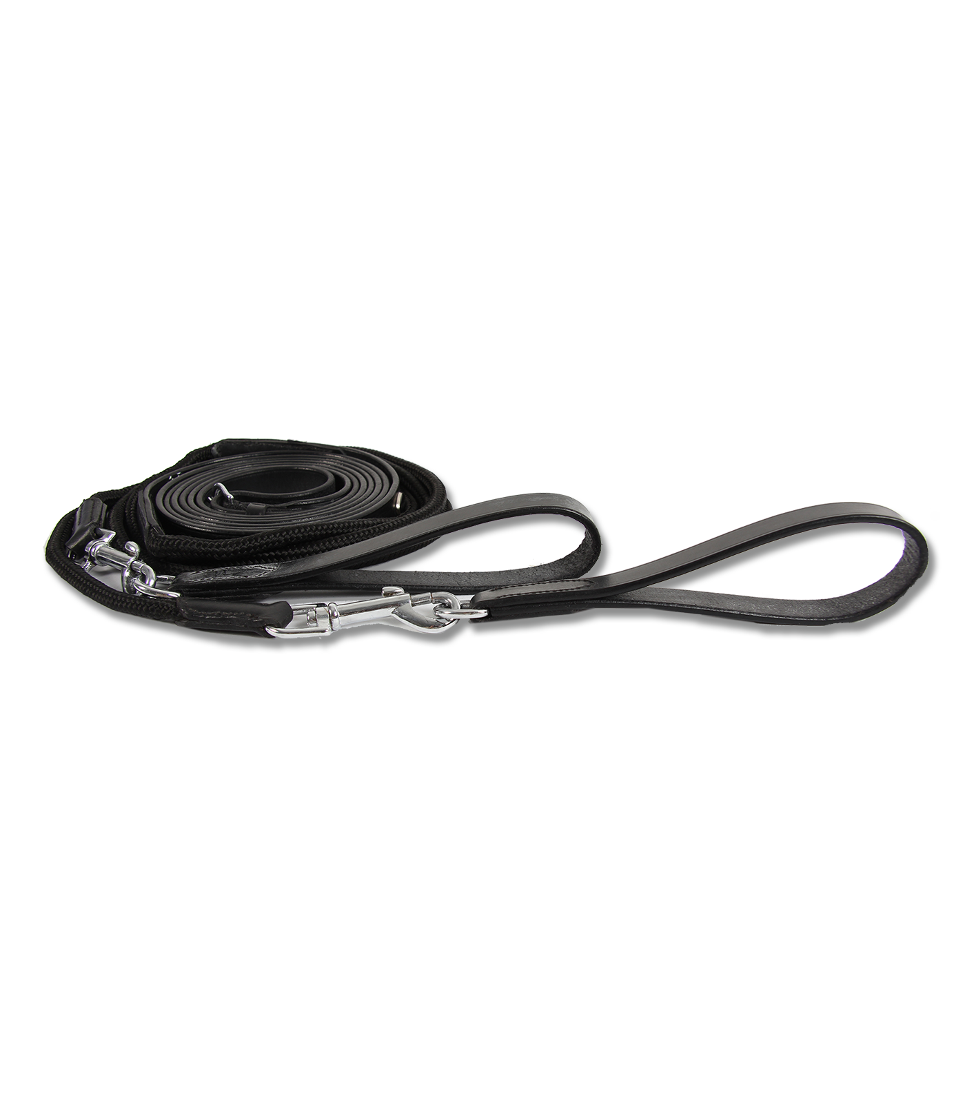 Czarna wodza skórzano-parciana WALDHAUSEN wyposażona jest w skórzaną pętlę na obu końcach oraz karabińczyk, co umożliwia łatwe odczepienie wodzy, zapewniając wygodę podczas pracy z koniem. Jej długość wynosi 2,35 m na każdą stronę, co zapewnia wystarczającą przestrzeń do precyzyjnego prowadzenia. Wodza w rozmiarze Full jest odpowiednia dla większości koni, łącząc funkcjonalność z solidną konstrukcją. Idealna do używania podczas treningów czy innych aktywności jeździeckich.