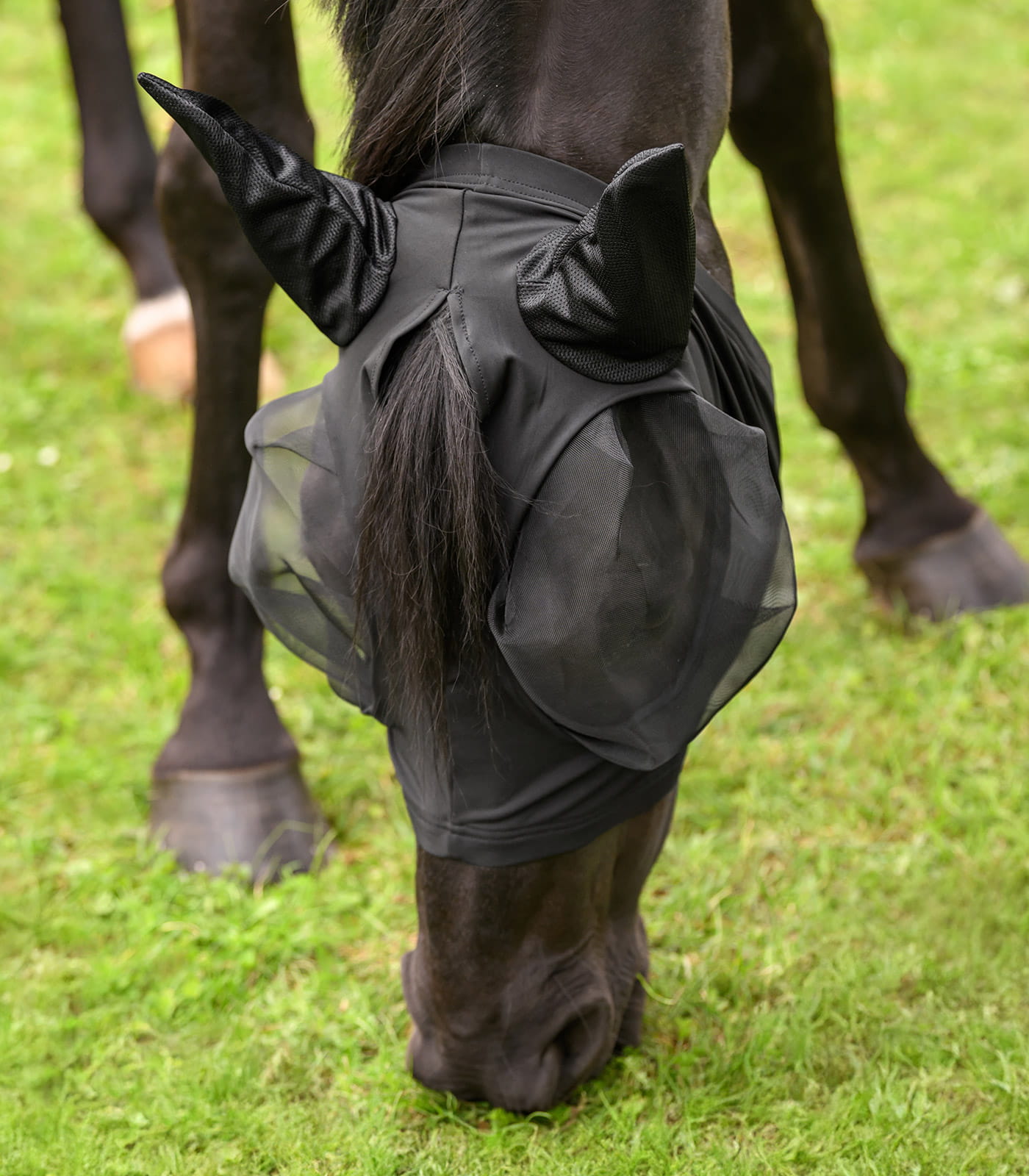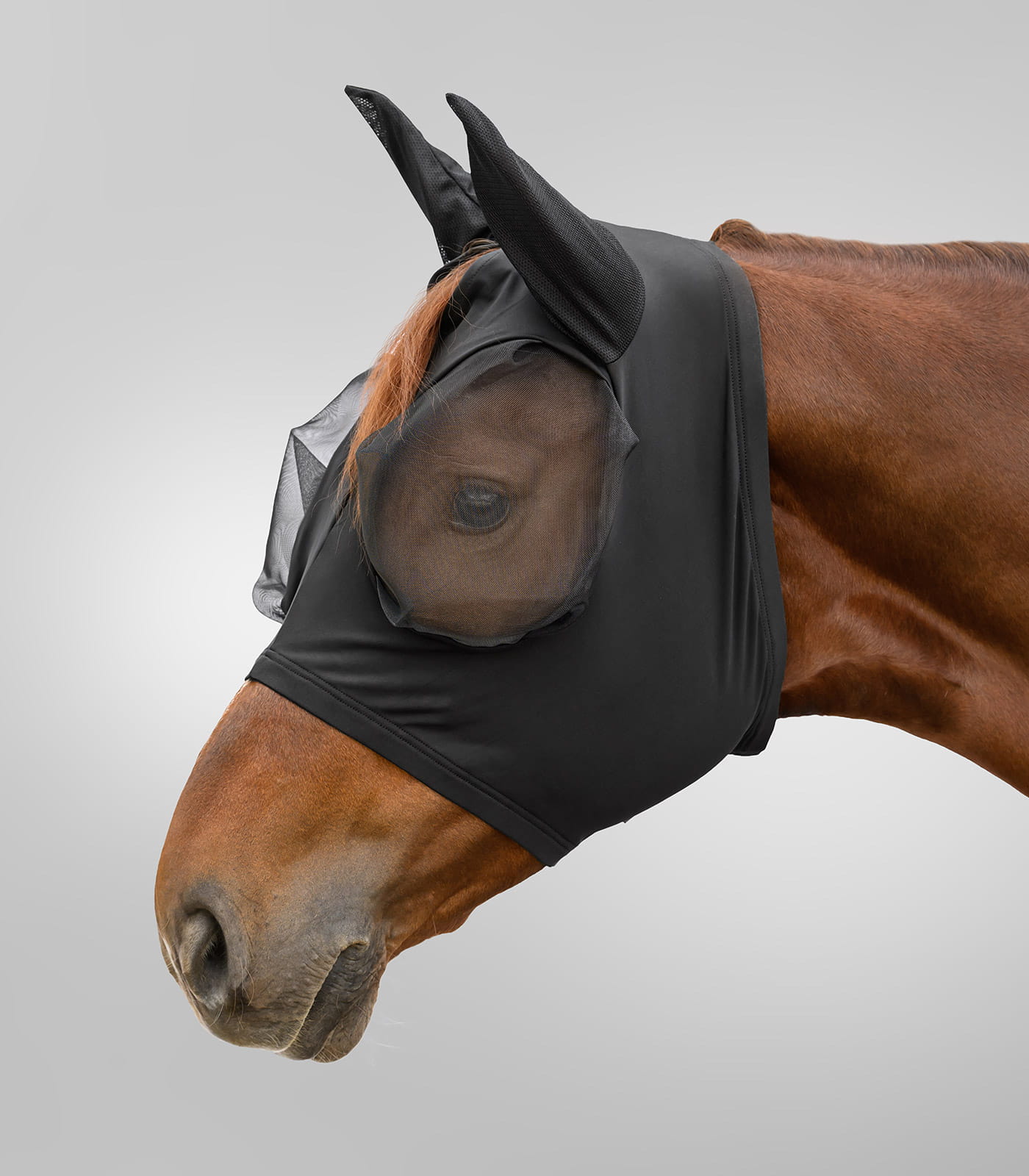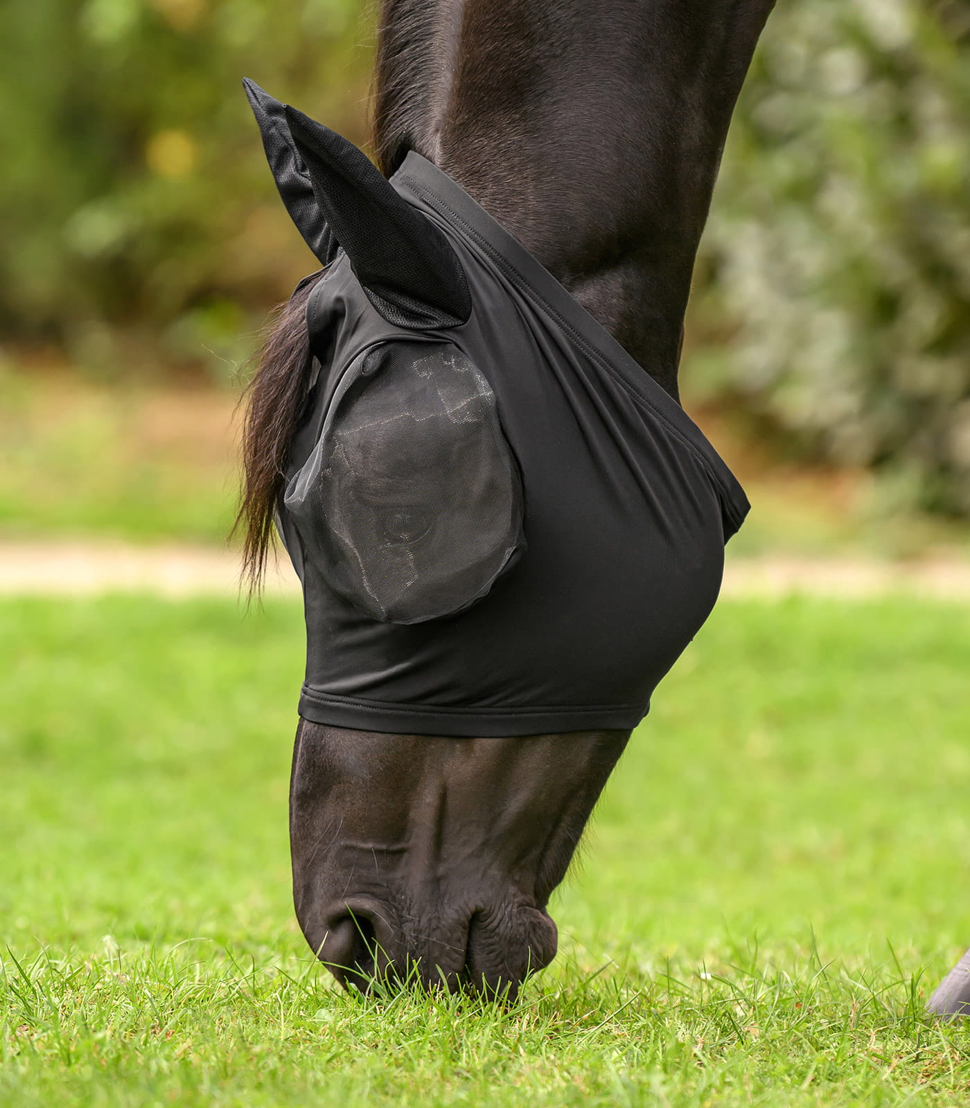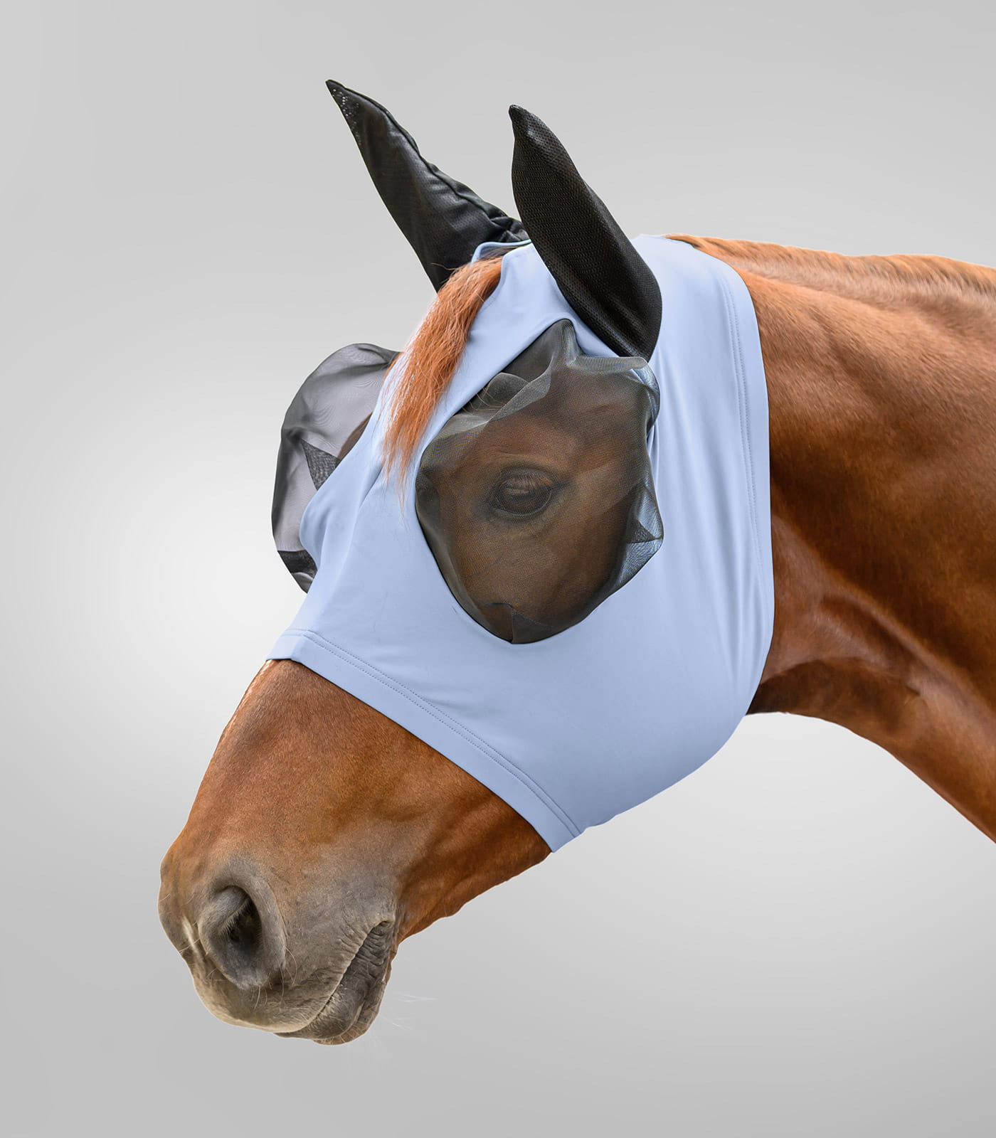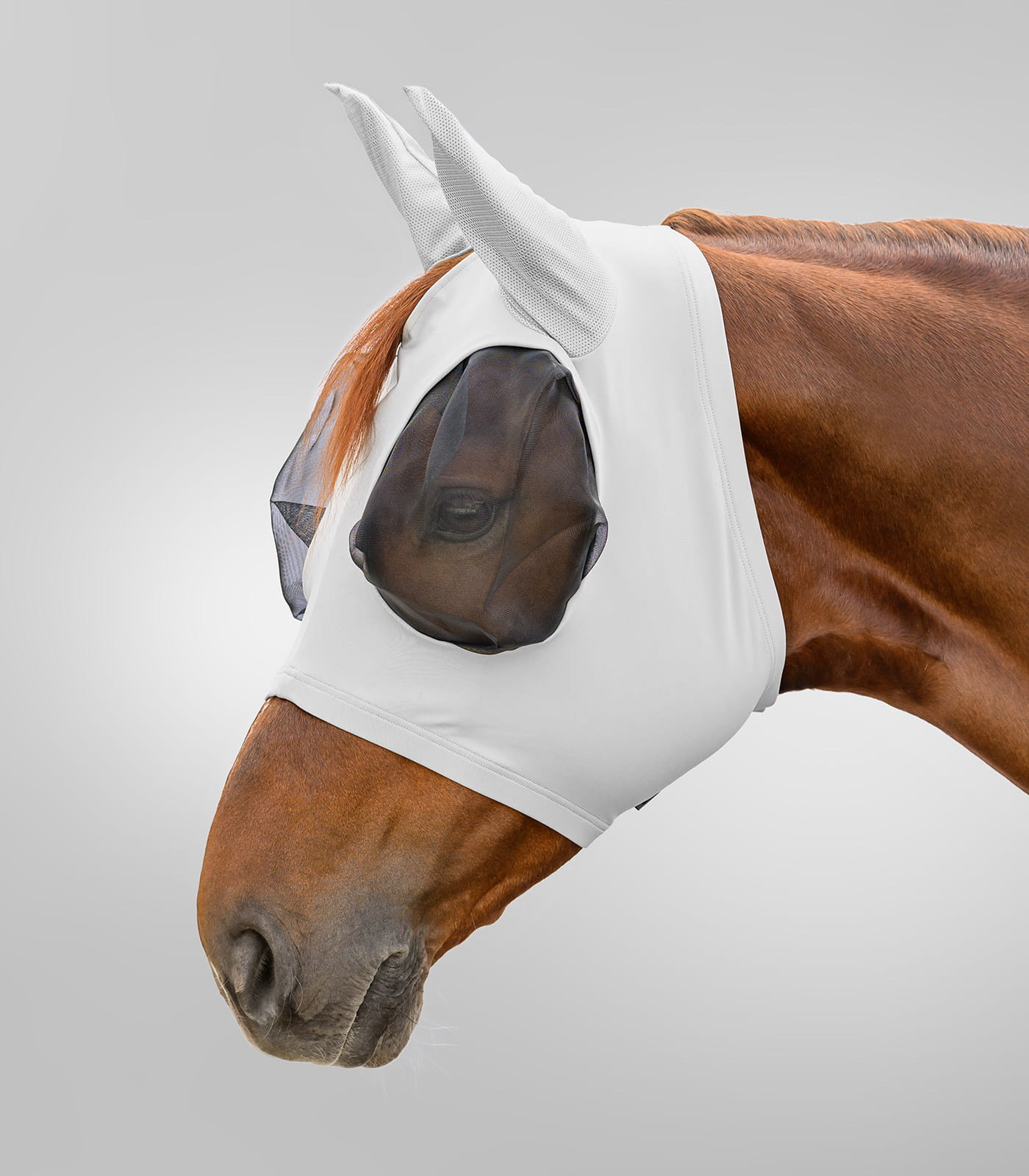 Dobrze przylegający krój ogranicza możliwość przedostawania się owadów pod maskę, jednocześnie zachowując swobodę ruchu. Powiększona przestrzeń w okolicy oczu zapewnia wysoki poziom komfortu i nie powoduje ucisku, co pozwala koniowi zachować naturalne zachowanie na padoku lub w trakcie odpoczynku. Lekka struktura materiału sprzyja przewiewności i nie obciąża głowy.