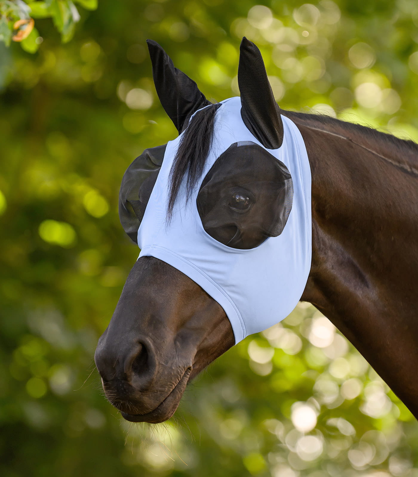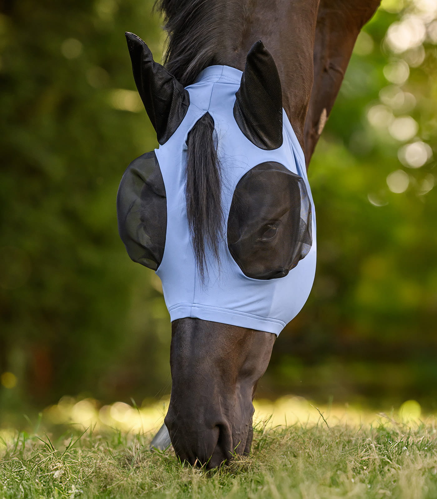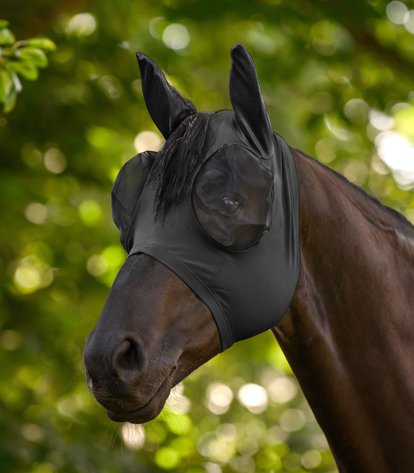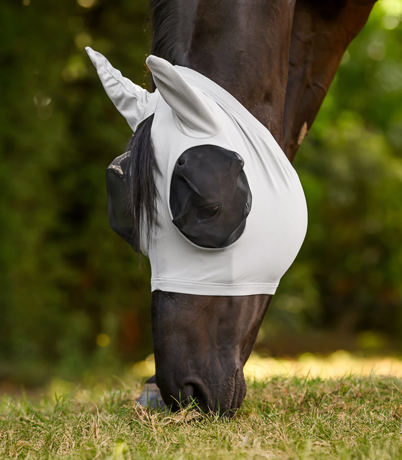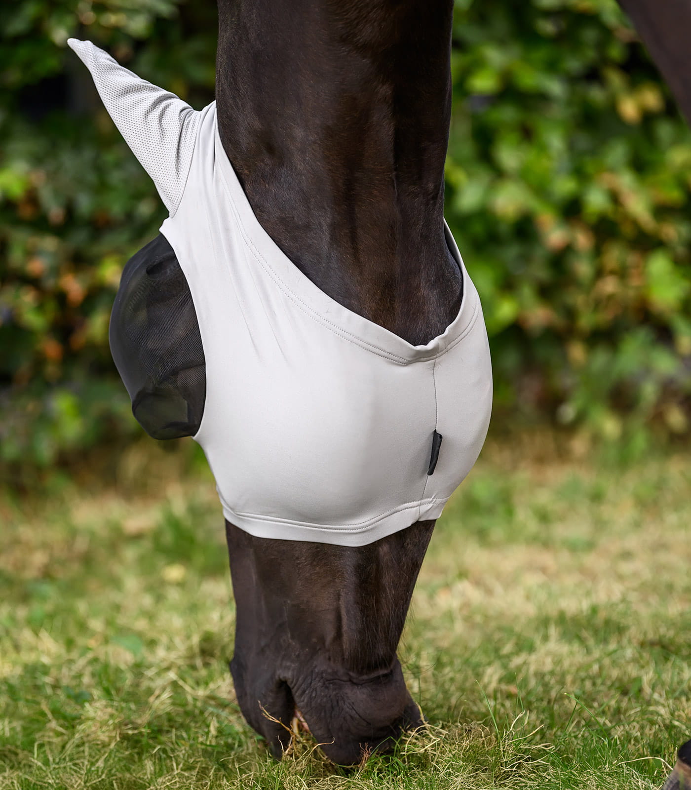Dobrze przylegający krój ogranicza możliwość przedostawania się owadów pod maskę, jednocześnie zachowując swobodę ruchu. Powiększona przestrzeń w okolicy oczu zapewnia wysoki poziom komfortu i nie powoduje ucisku, co pozwala koniowi zachować naturalne zachowanie na padoku lub w trakcie odpoczynku. Lekka struktura materiału sprzyja przewiewności i nie obciąża głowy.