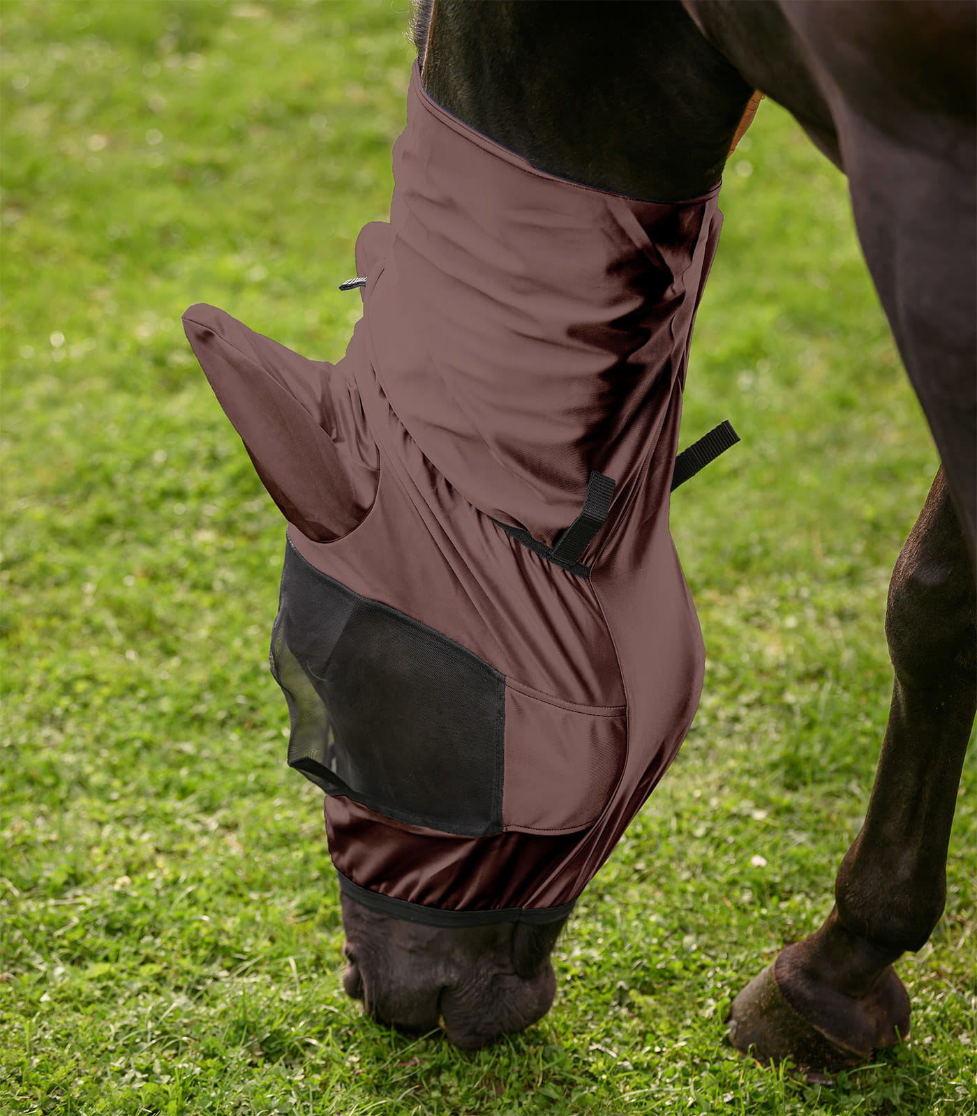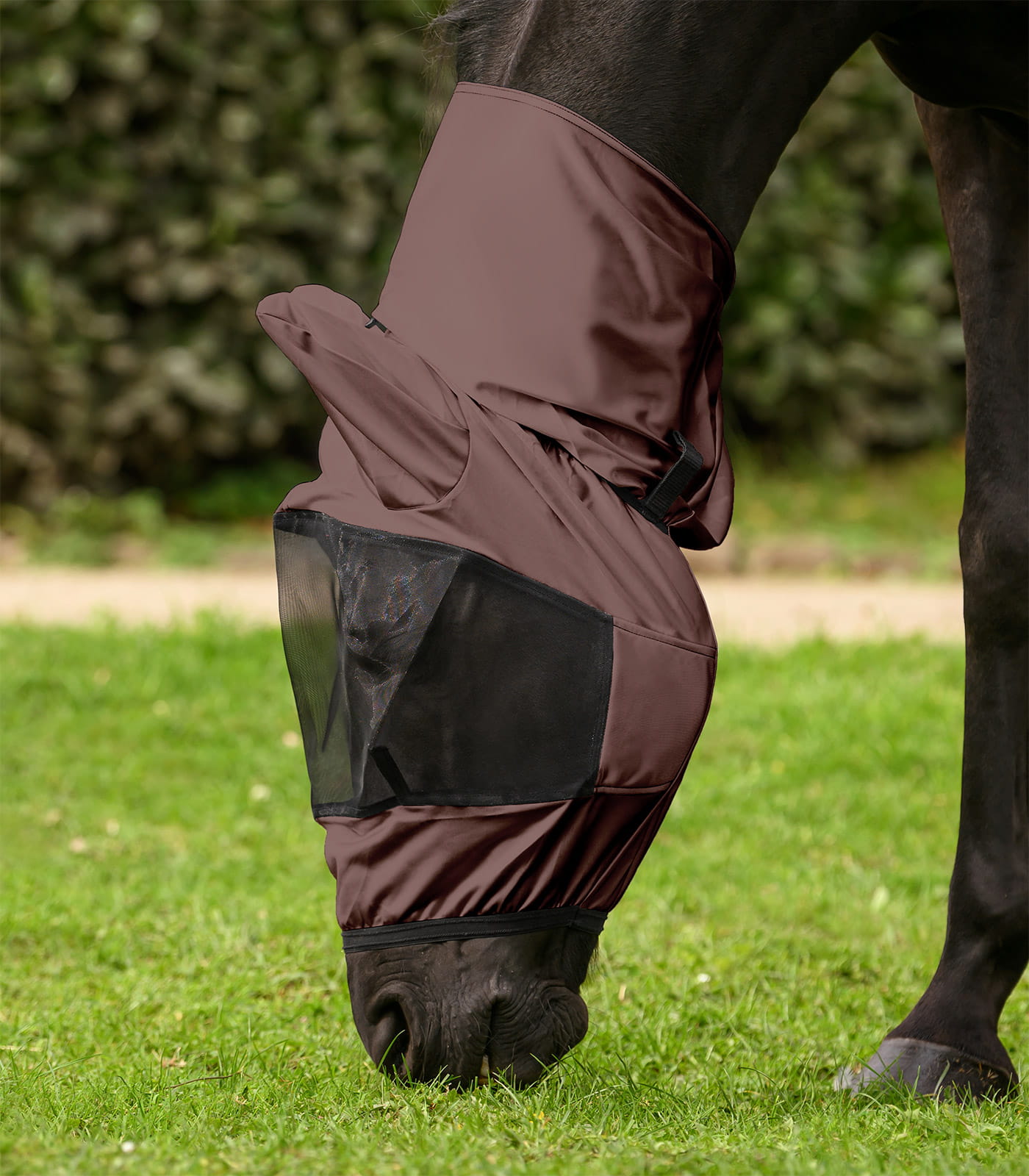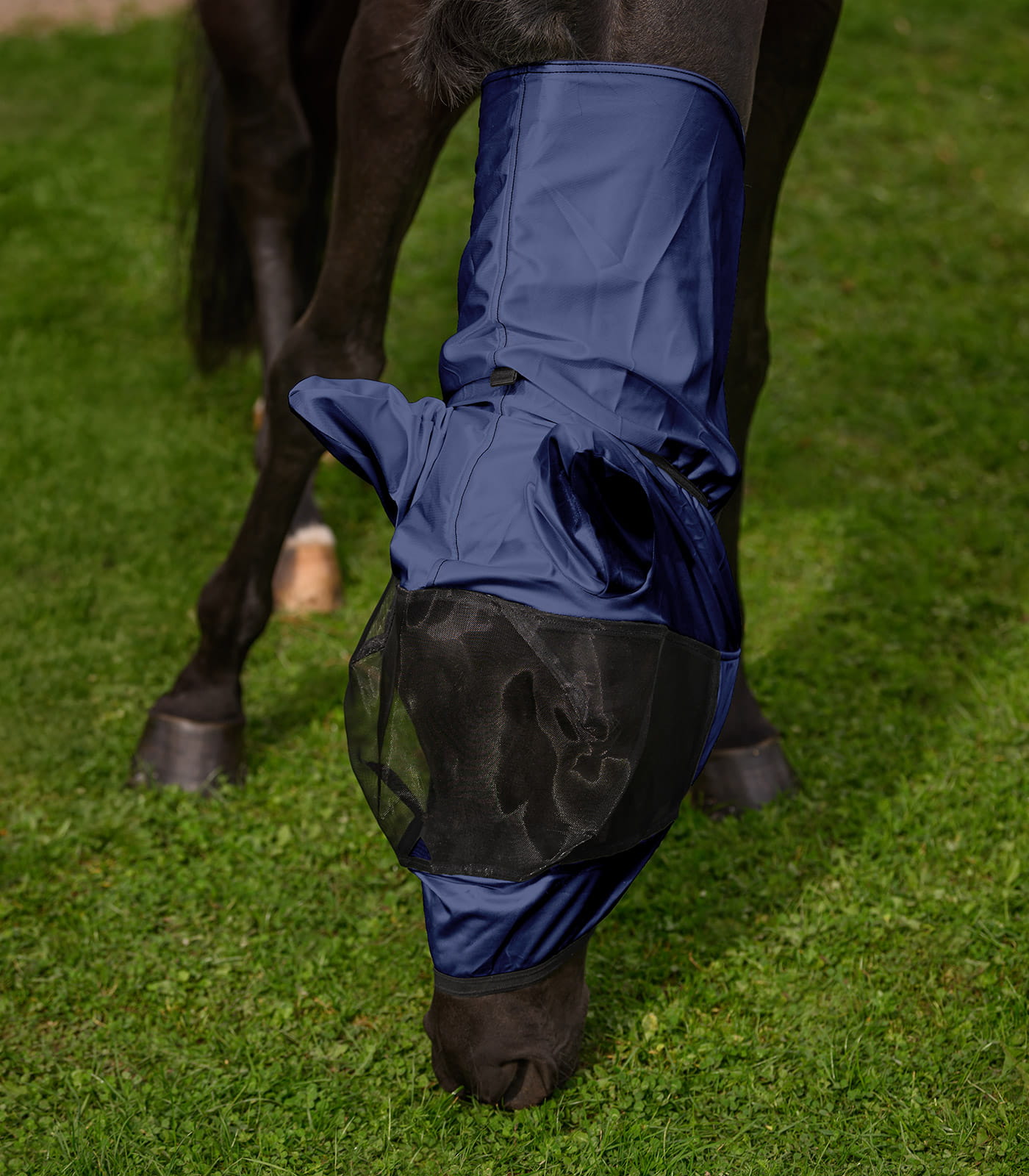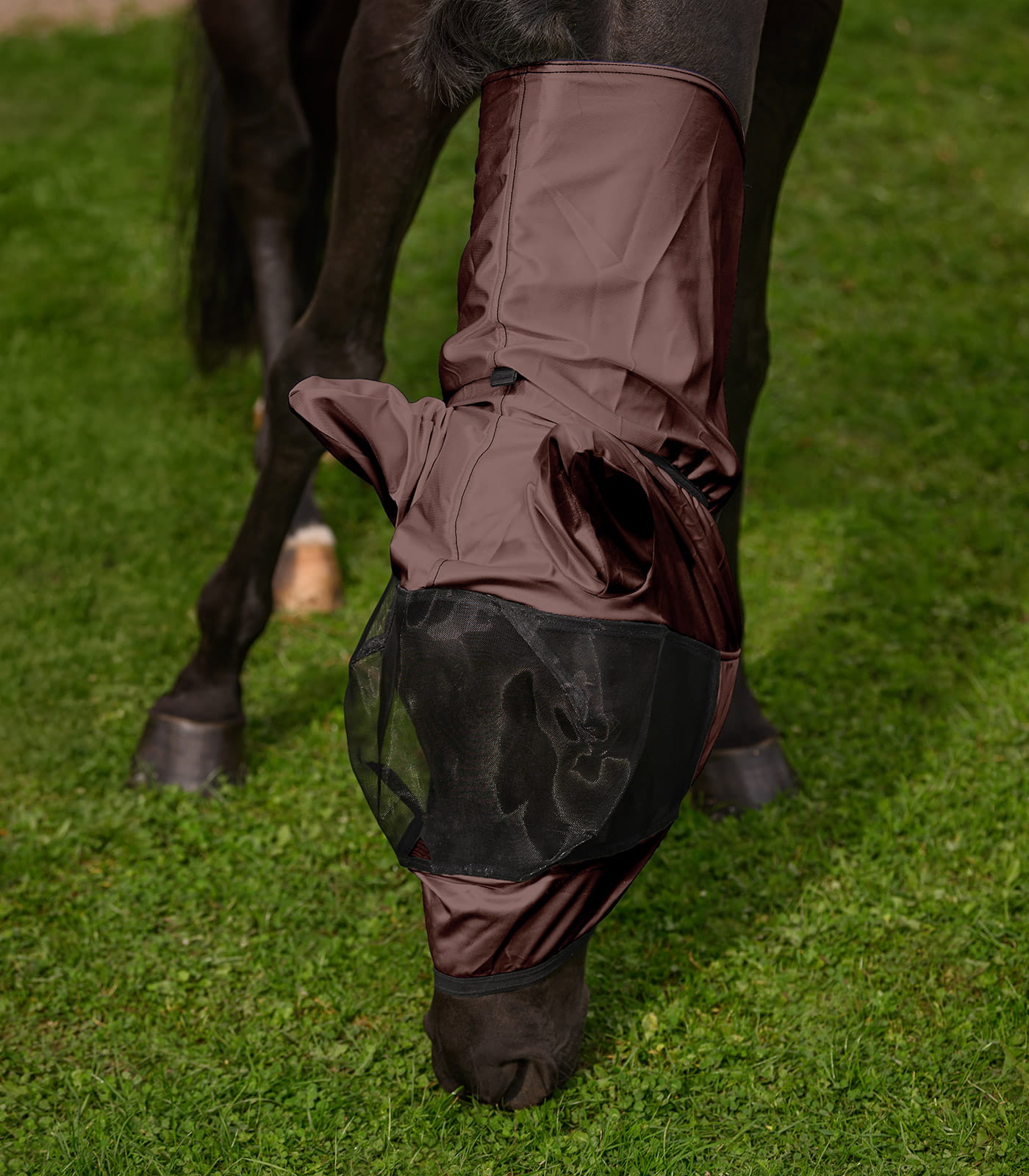 Materiał wykonania stanowi poliester o trwałej strukturze, odporny na codzienne użytkowanie i warunki zewnętrzne. Produkt można prać w temperaturze 30°C, co ułatwia utrzymanie higieny. Lekka forma sprzyja komfortowi noszenia przez dłuższy czas. To praktyczny element wspierający ochronę konia przed owadami w okresie letnim.