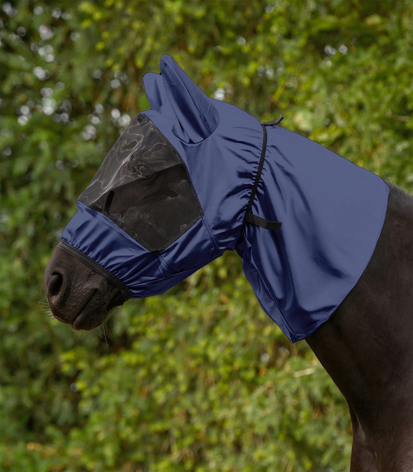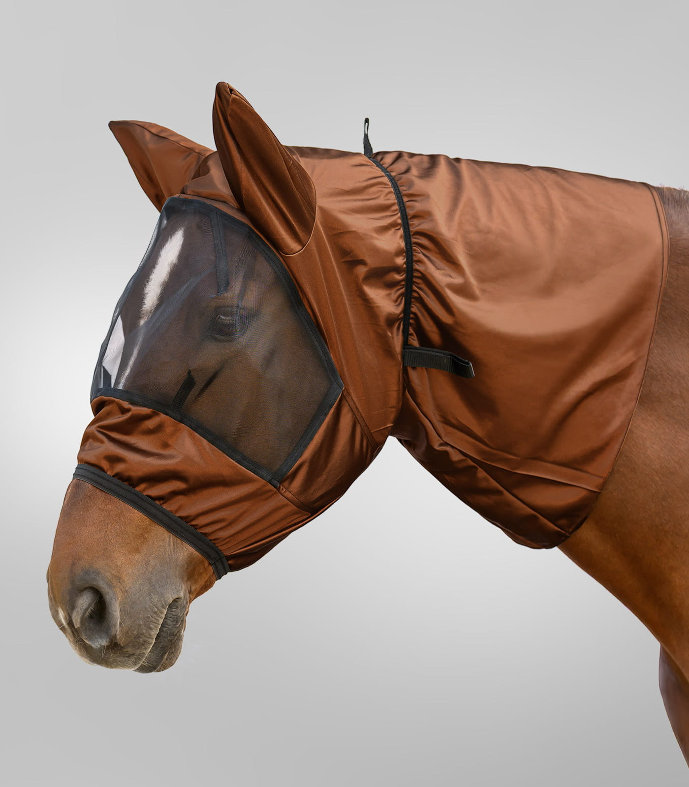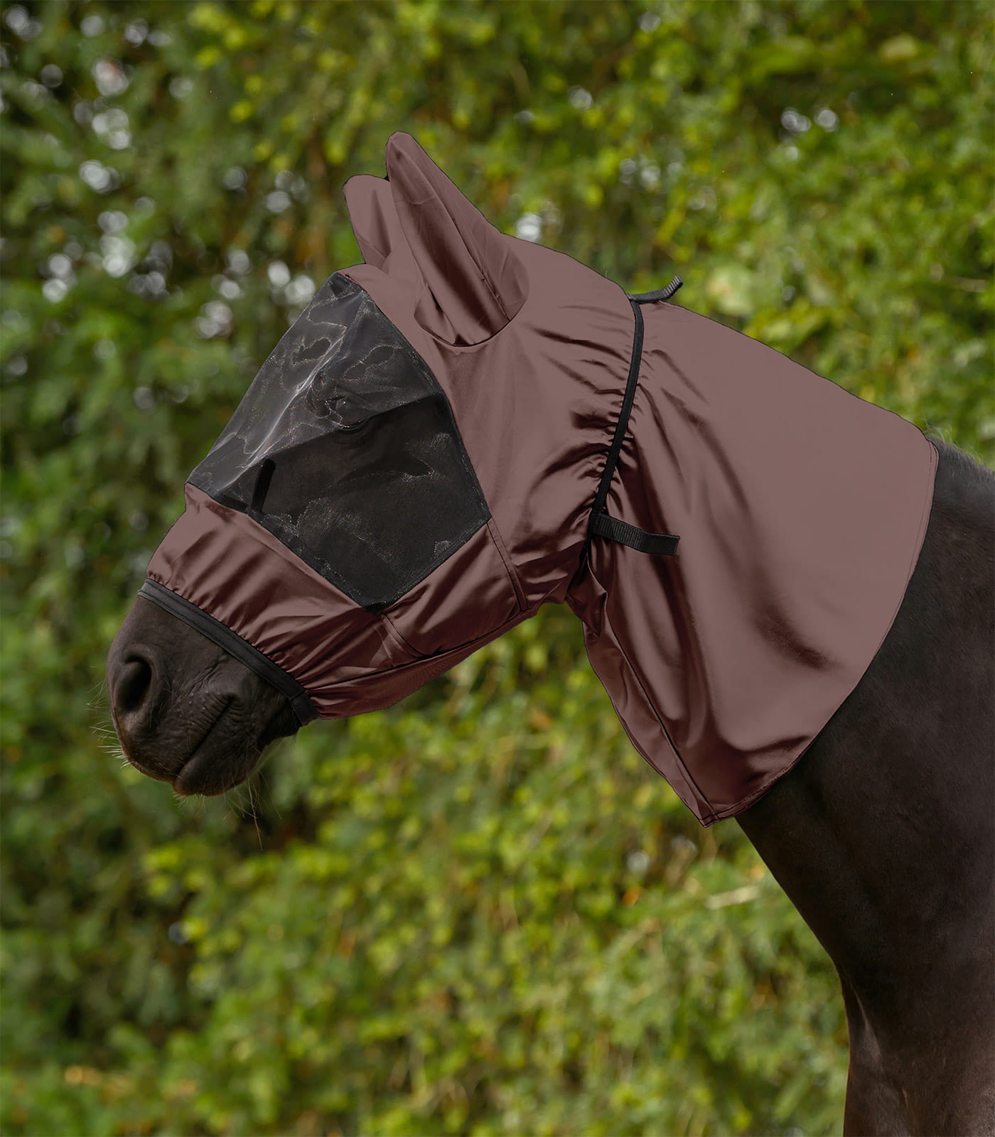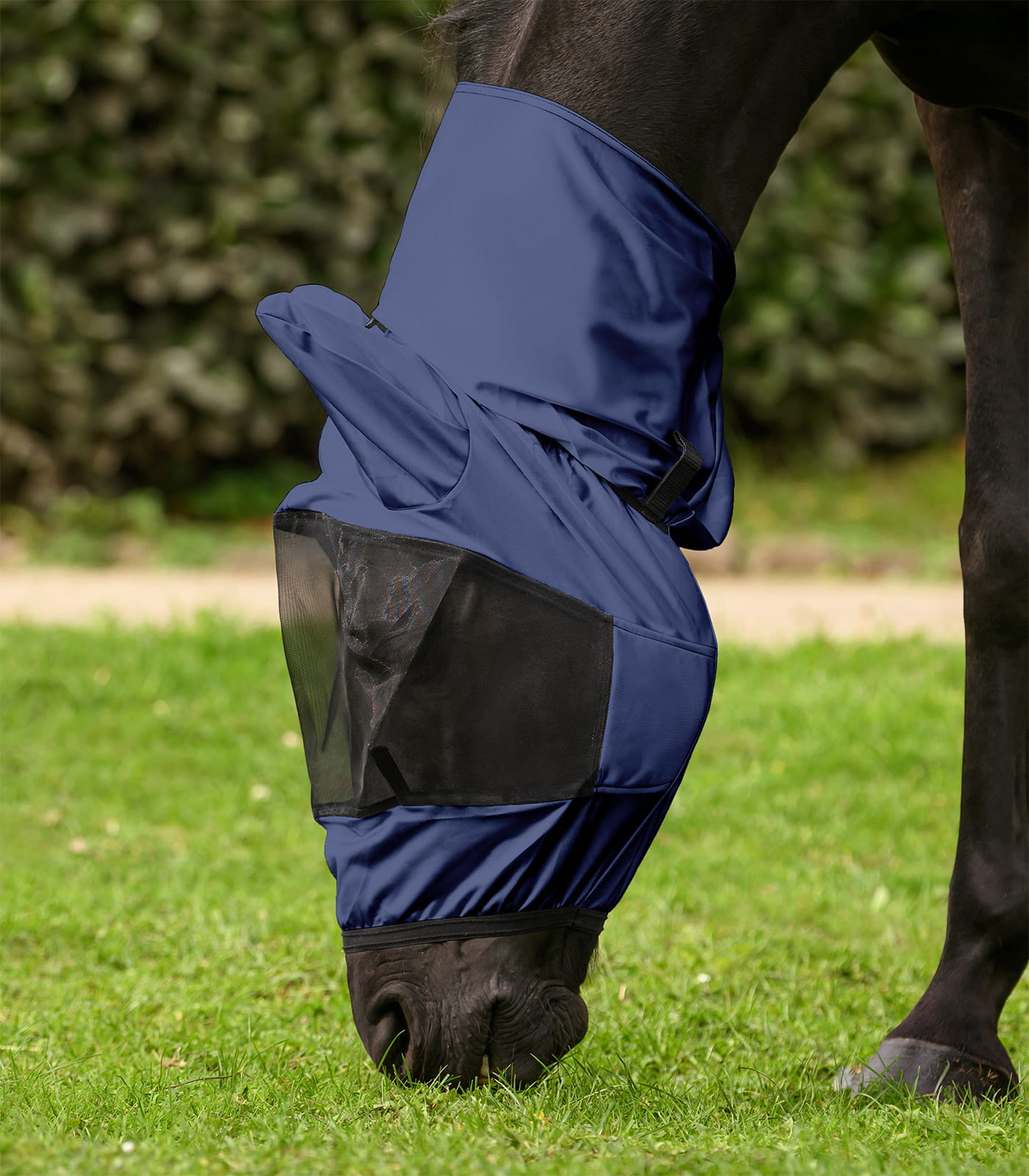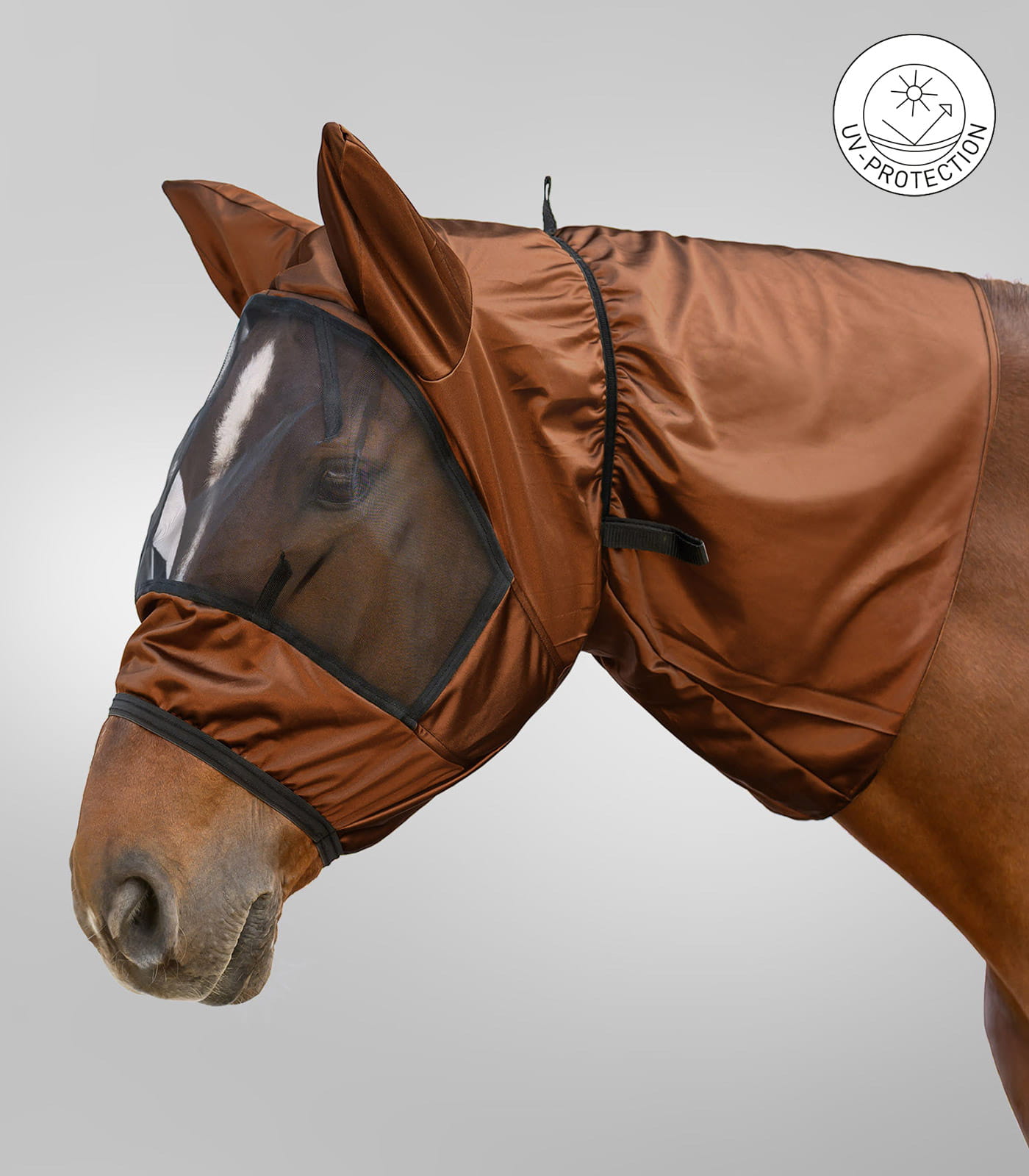 Materiał wykonania stanowi poliester o trwałej strukturze, odporny na codzienne użytkowanie i warunki zewnętrzne. Produkt można prać w temperaturze 30°C, co ułatwia utrzymanie higieny. Lekka forma sprzyja komfortowi noszenia przez dłuższy czas. To praktyczny element wspierający ochronę konia przed owadami w okresie letnim.