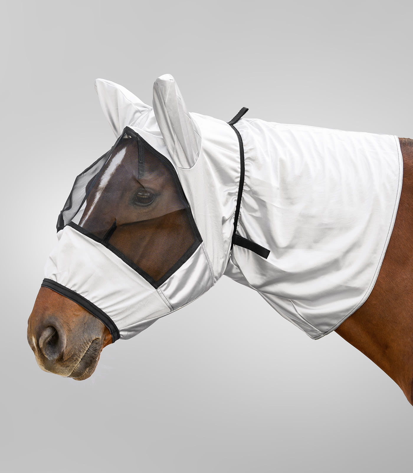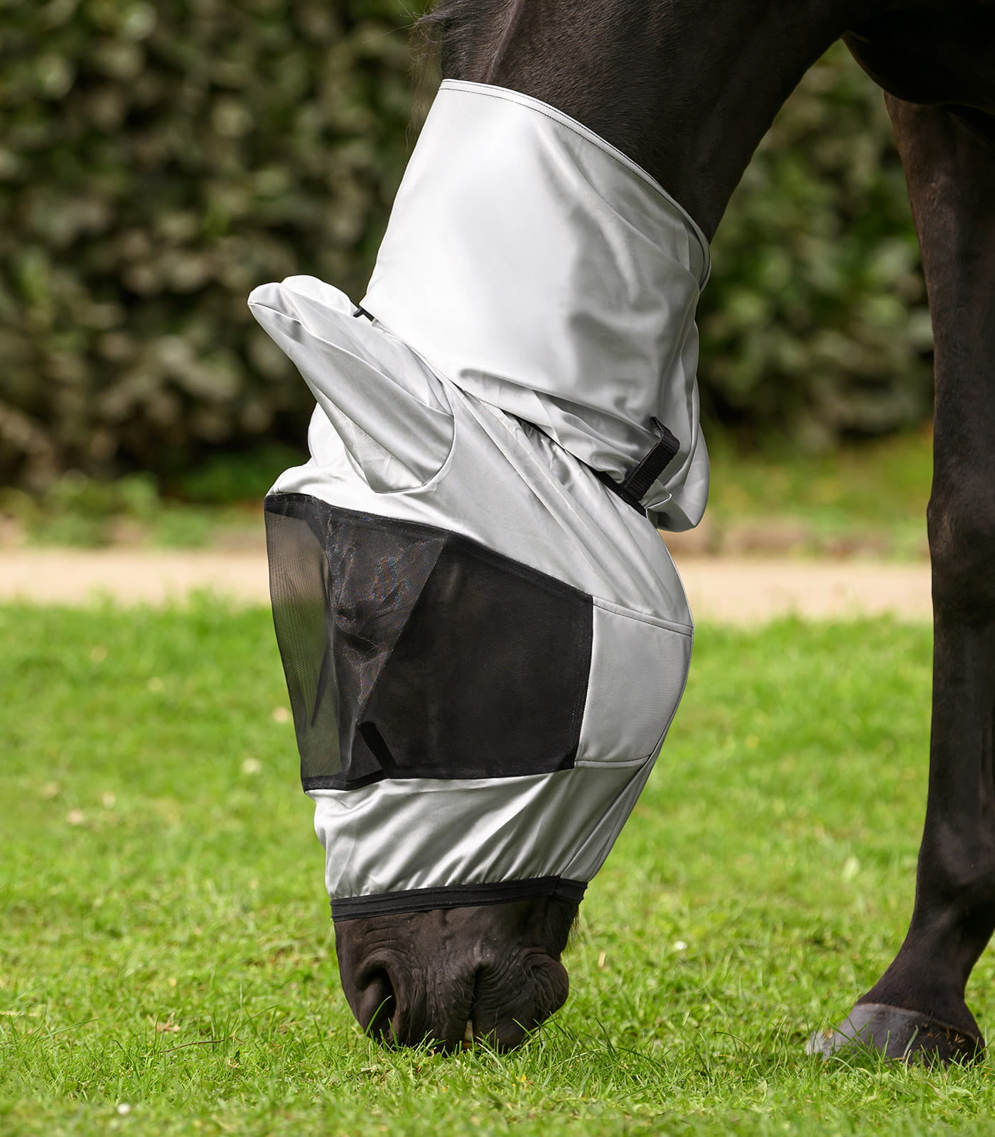 Profilujące zaszewki wspierają dopasowanie do kształtu głowy i pomagają utrzymać stabilne ułożenie. Maska może być przypięta do pasującej derki przeciw owadom za pomocą rzepów, co ułatwia połączenie obu elementów w jeden zestaw. Jest kompatybilna z wersjami Premium oraz Basic, co zwiększa zakres zastosowań. Takie rozwiązanie pozwala na spójne zabezpieczenie podczas wypasu.