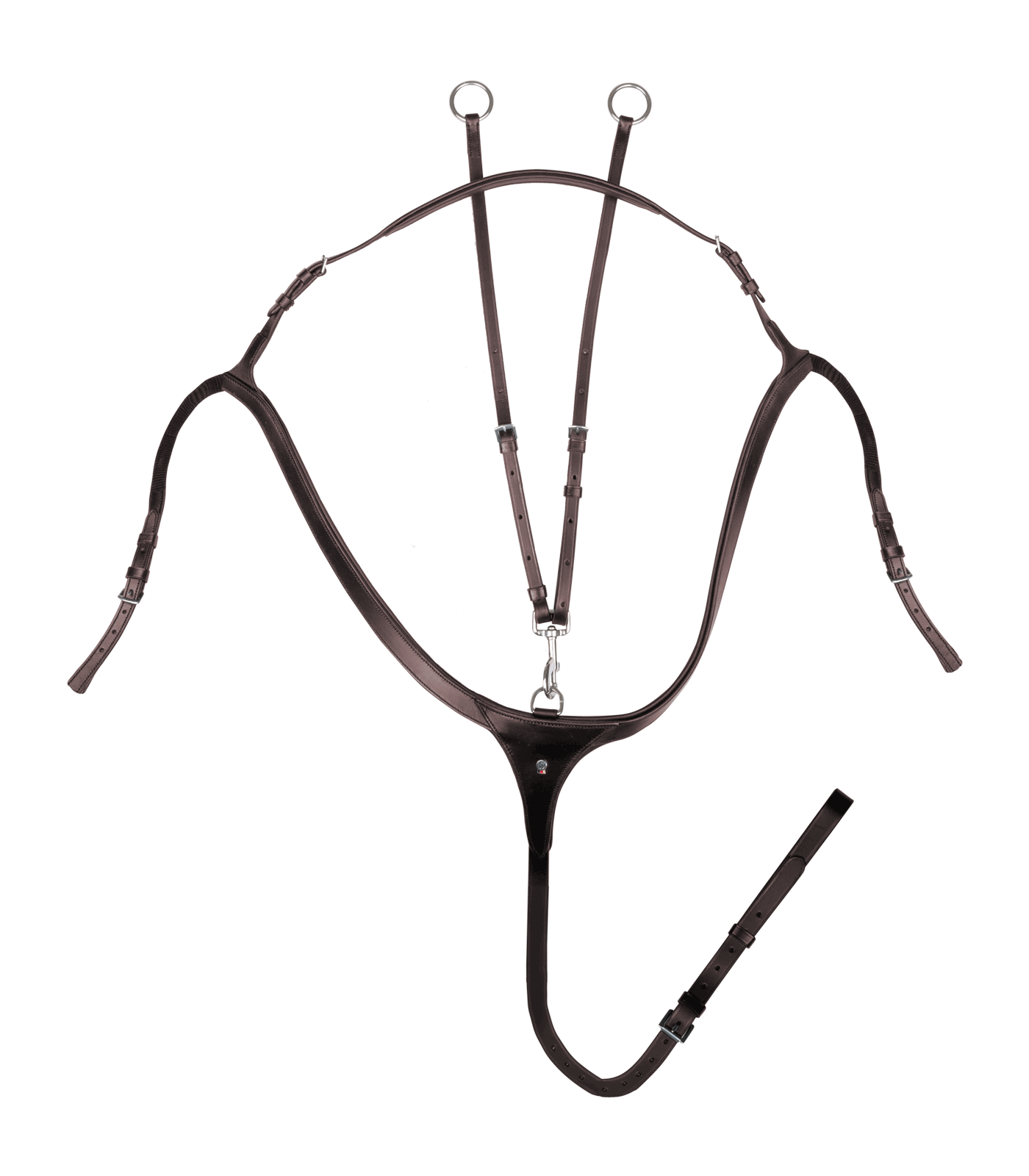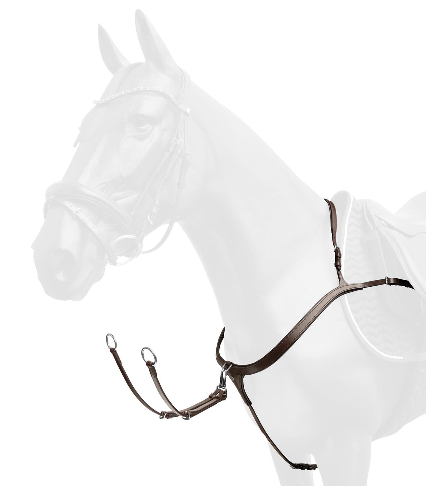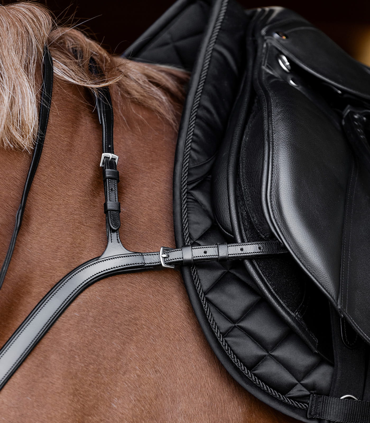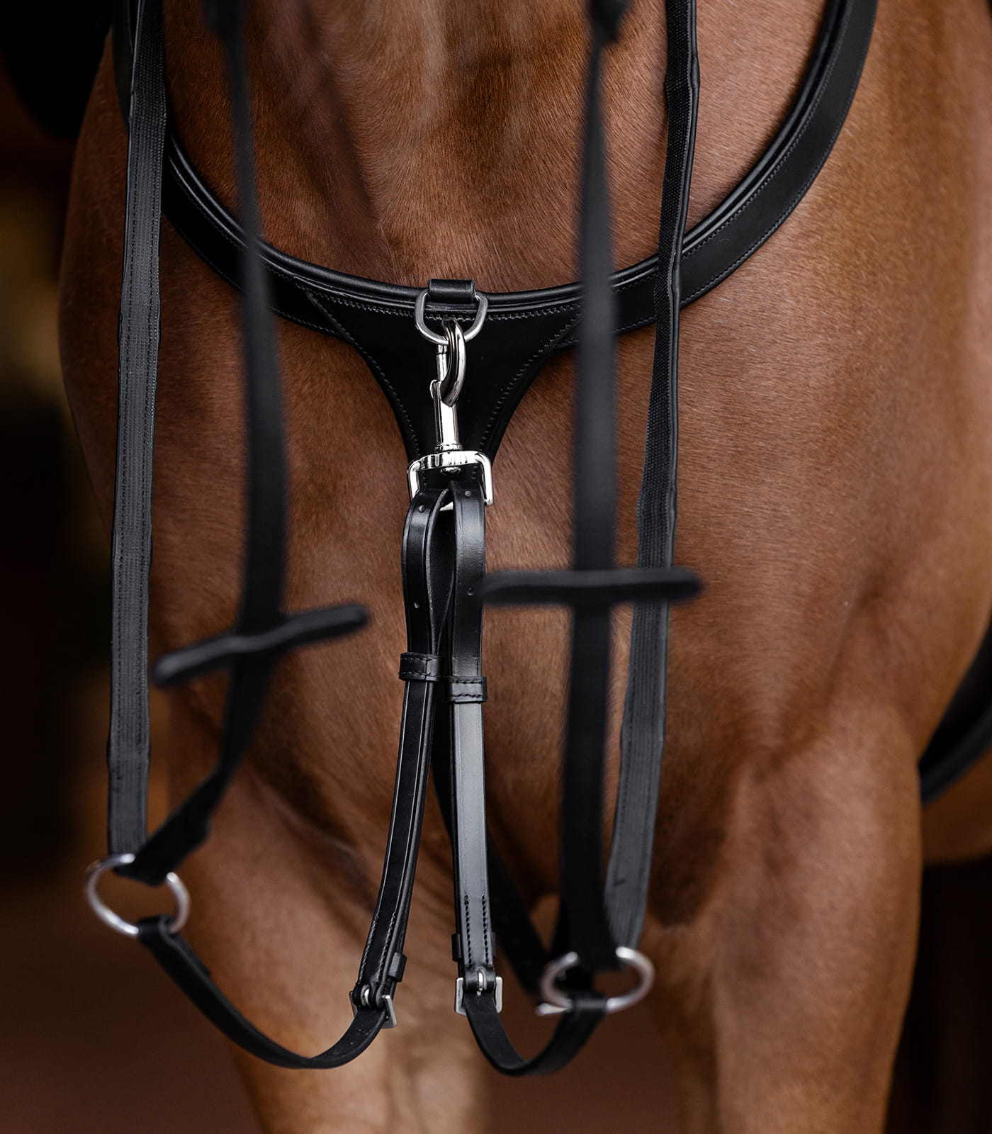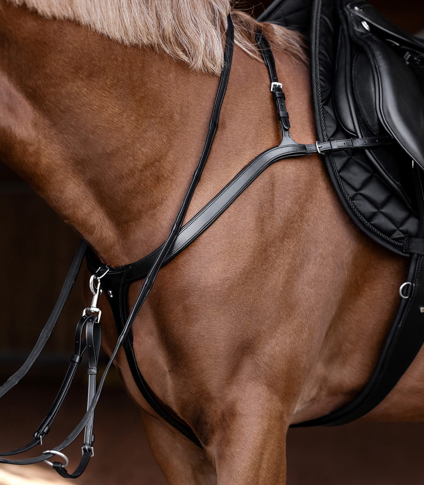Anatomiczne wycięcie napierśnika pozwala na pełną swobodę ruchów w okolicach barków, jednocześnie zapewniając odpowiednie wsparcie dla siodła. Napierśnik mocowany jest w trzech punktach: na popręgu za pomocą regulowanego pasku skórzanego oraz na paskach popręgu. Model ten łączy stabilność z komfortem, wspierając optymalną wydajność konia podczas treningów.