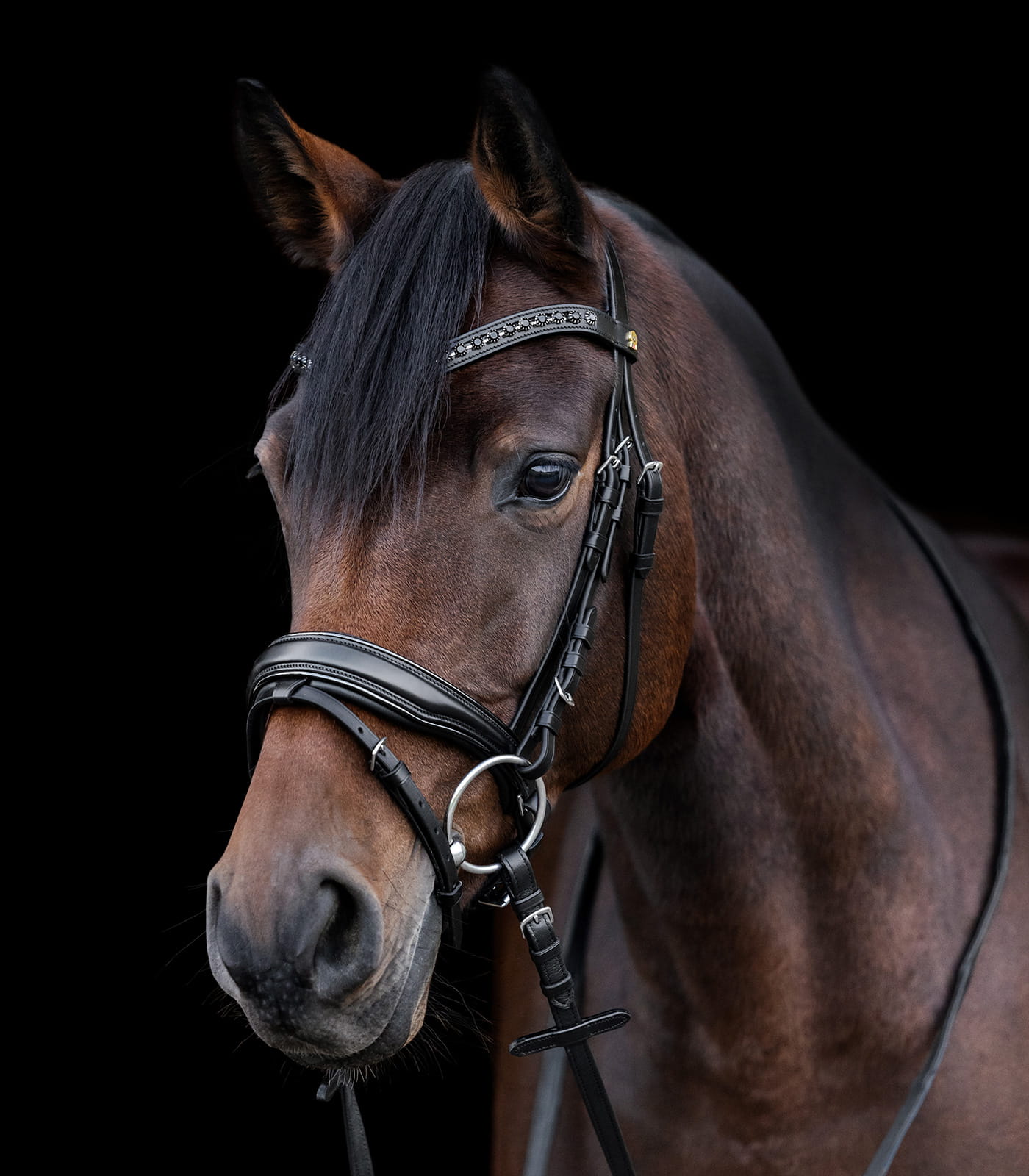 WALDHAUSEN Ogłowie S-Line BlackShine to eleganckie ogłowie z nachrapnikiem szwedzkim. Posiada szeroką, anatomicznie ukształtowaną część potyliczną z dodatkowymi przestrzeniami na uszy, co zapewnia komfort koniowi. Naczółek jest delikatnie wyprofilowany i ozdobiony ciemnymi kryształkami, co nadaje ogłowiu subtelnej elegancji. Nachrapnik i naczółek wyściełano miękko, co zwiększa komfort użytkowania. Okucia ze stali nierdzewnej zapewniają trwałość i odporność na uszkodzenia. W komplecie nie ma wodzy.