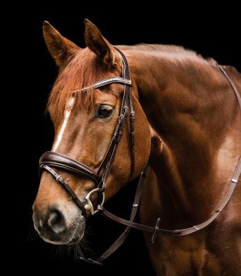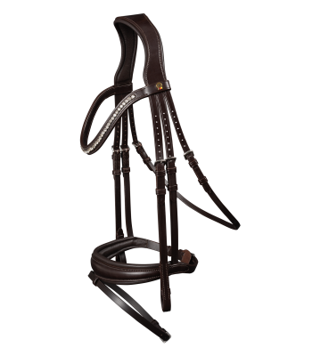 Elegancki opadający naczółek zdobiony błyszczącymi cyrkoniami nadaje ogłowiu stylowy i luksusowy wygląd, sprawiając, że doskonale sprawdzi się zarówno na zawody, jak i do codziennego treningu.