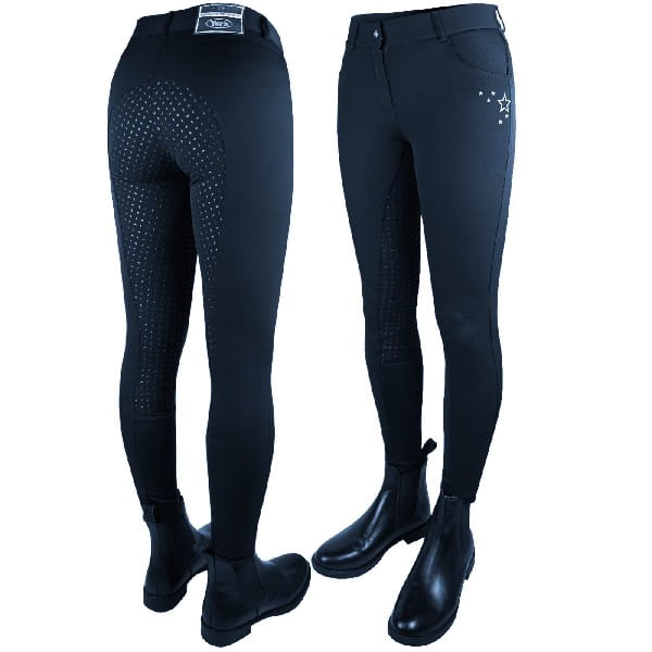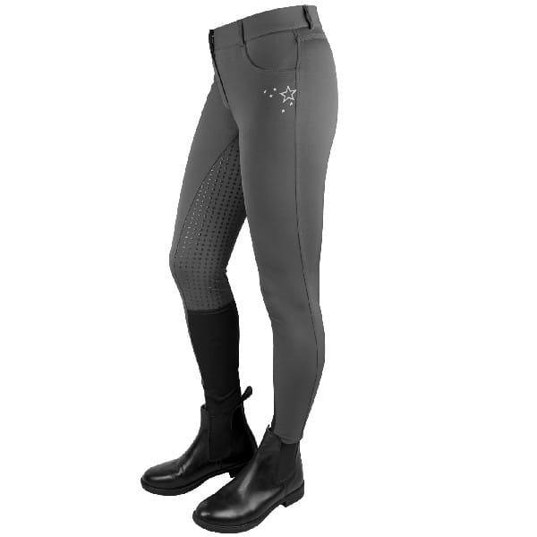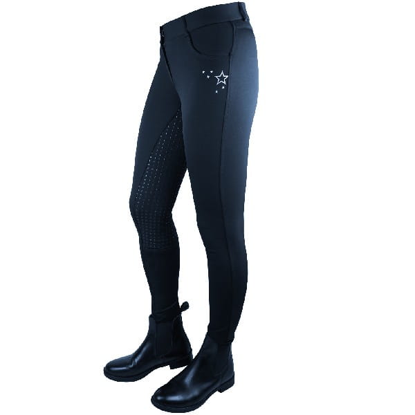 Pełny silikonowy lej zapewnia doskonałą przyczepność do siodła, co wpływa na stabilność dosiadu i większe bezpieczeństwo podczas jazdy. Subtelne, srebrzyste ozdoby w kształcie gwiazdek dodają bryczesom elegancji i unikalnego charakteru.
