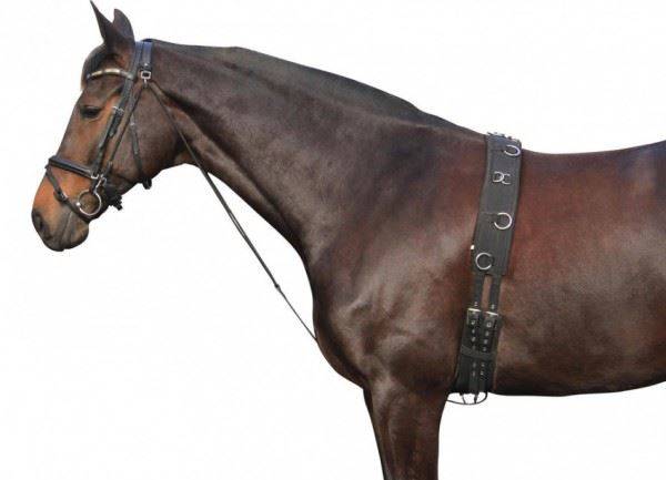 Wysoka jakość materiałów: Skórzane i sznurkowe elementy zapewniają trwałość oraz komfort zarówno dla konia, jak i dla osoby pracującej z koniem.