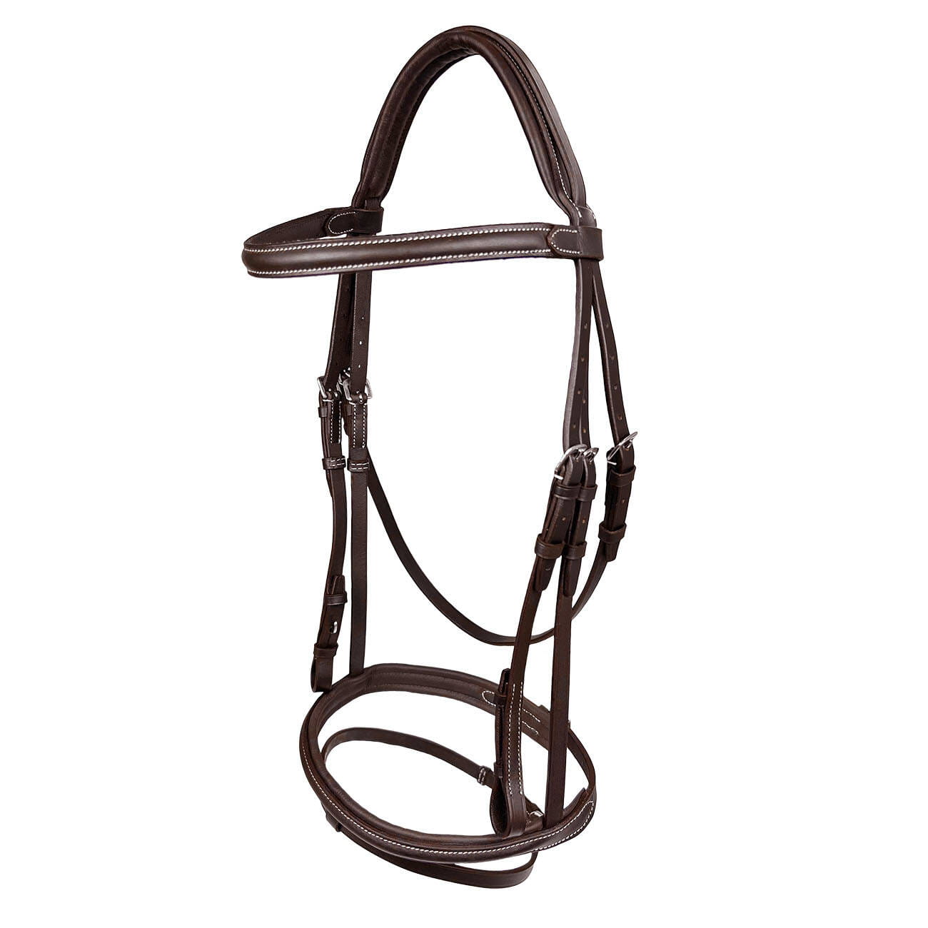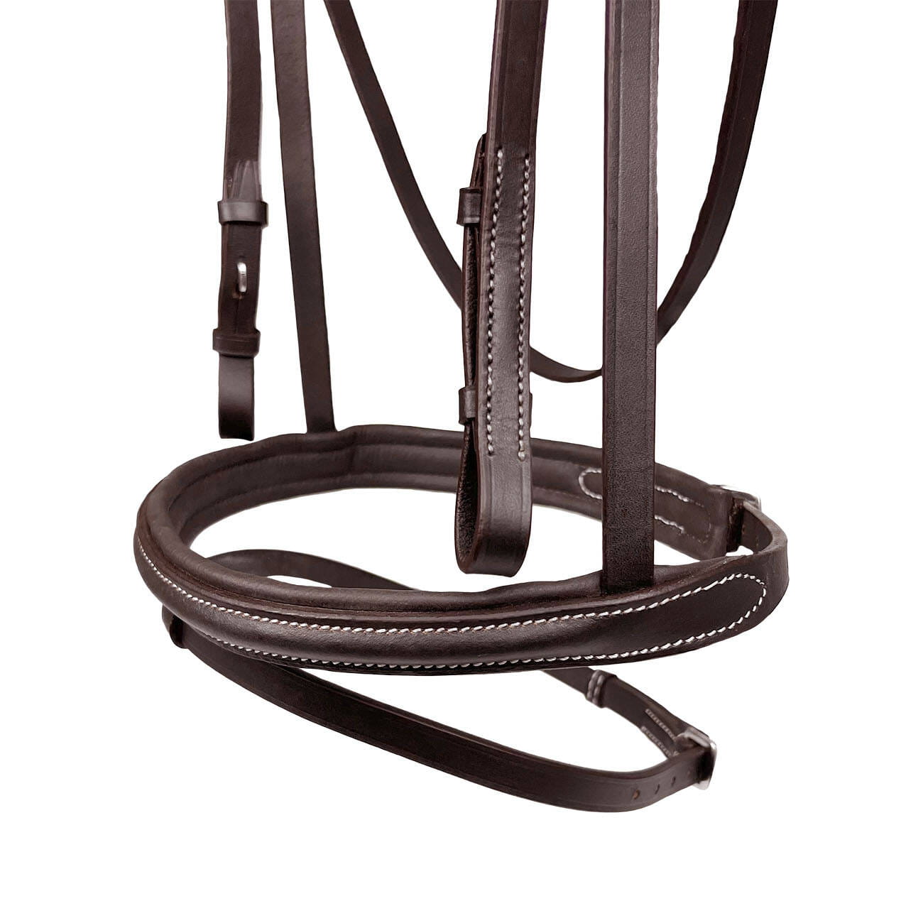 Ogłowie Aleida to klasyczna brązowa tranzelka, która charakteryzuje się eleganckimi, kontrastowymi przeszyciami, nadającymi jej wyjątkowego charakteru. Miękko podszyty pasek potyliczny oraz nachrapnik zapewniają komfort podczas noszenia, eliminując ryzyko obtarć. Paski policzkowe oraz wodze zapinane na haczyki umożliwiają łatwą wymianę wędzidła lub wodzy, co czyni to ogłowie funkcjonalnym rozwiązaniem. Regulowane podgardle z obu stron pozwala na lepsze dopasowanie do głowy konia.