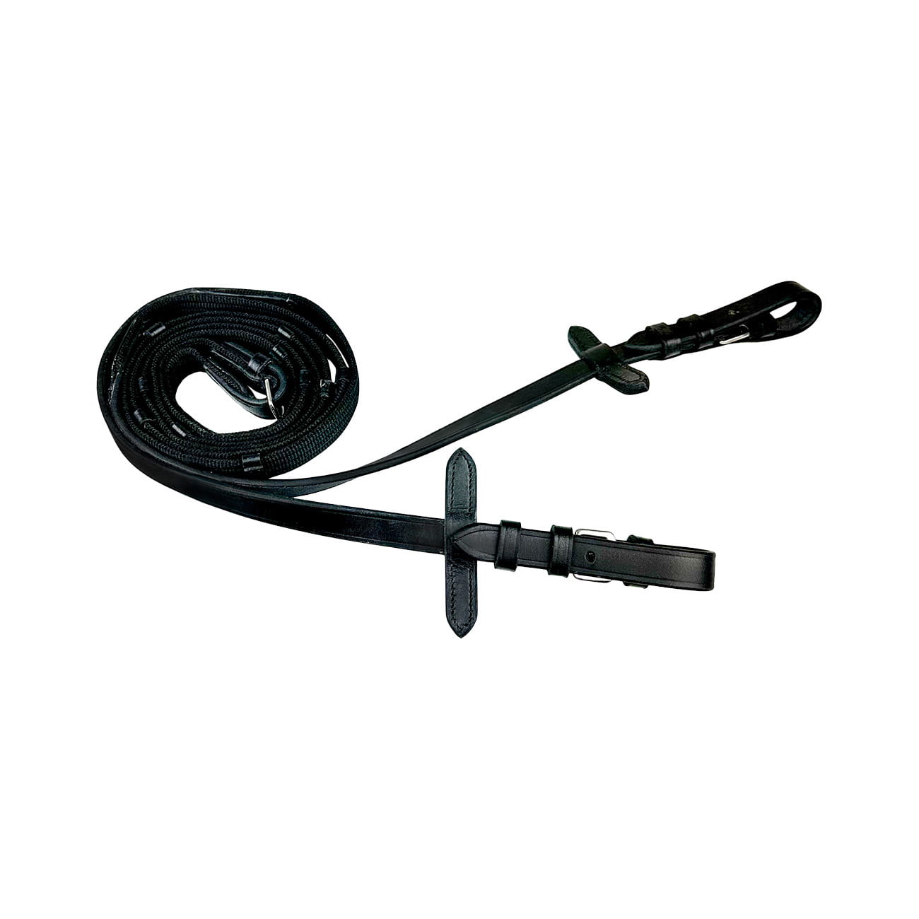 York wodze parciano-skórzane Afra – klasyczne wodze skórzano-parciane ze stoperami do stabilnego kontaktu i czytelnych sygnałów. Łączą taśmę parcianą z końcówkami skórzanymi. Okucia wykonano ze stali nierdzewnej, więc są odporne na korozję i wilgoć. Pasują do standardowych ogłowi.