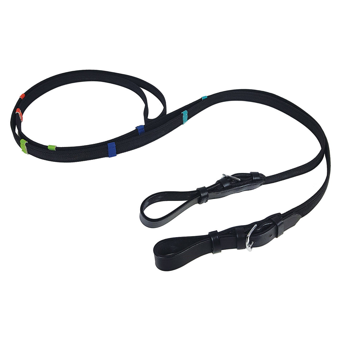 - Charakterystyka: Antypoślizgowe wodze z kolorowymi stoperami, pomagają w nauce techniki jazdy konnej.